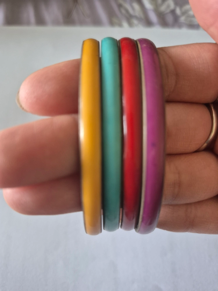 18Here's a set of four colourful bangles! They come in yellow, teal, red, and purple. These are perfect for adding a pop of colour to any outfit!