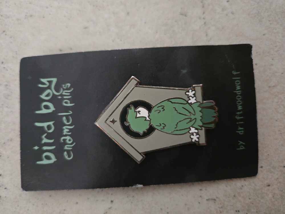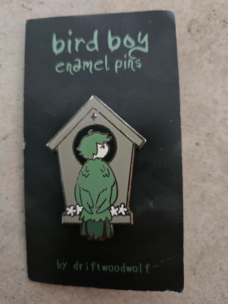 Very cute limited edition Bird Boy enamel pin by Driftwoodwolf -- this model is no longer available on etsy! It's brand new in (on) the original packaging and ready to add some flair to your jacket or bag. Would make a great gift for a Bird/Boy lover