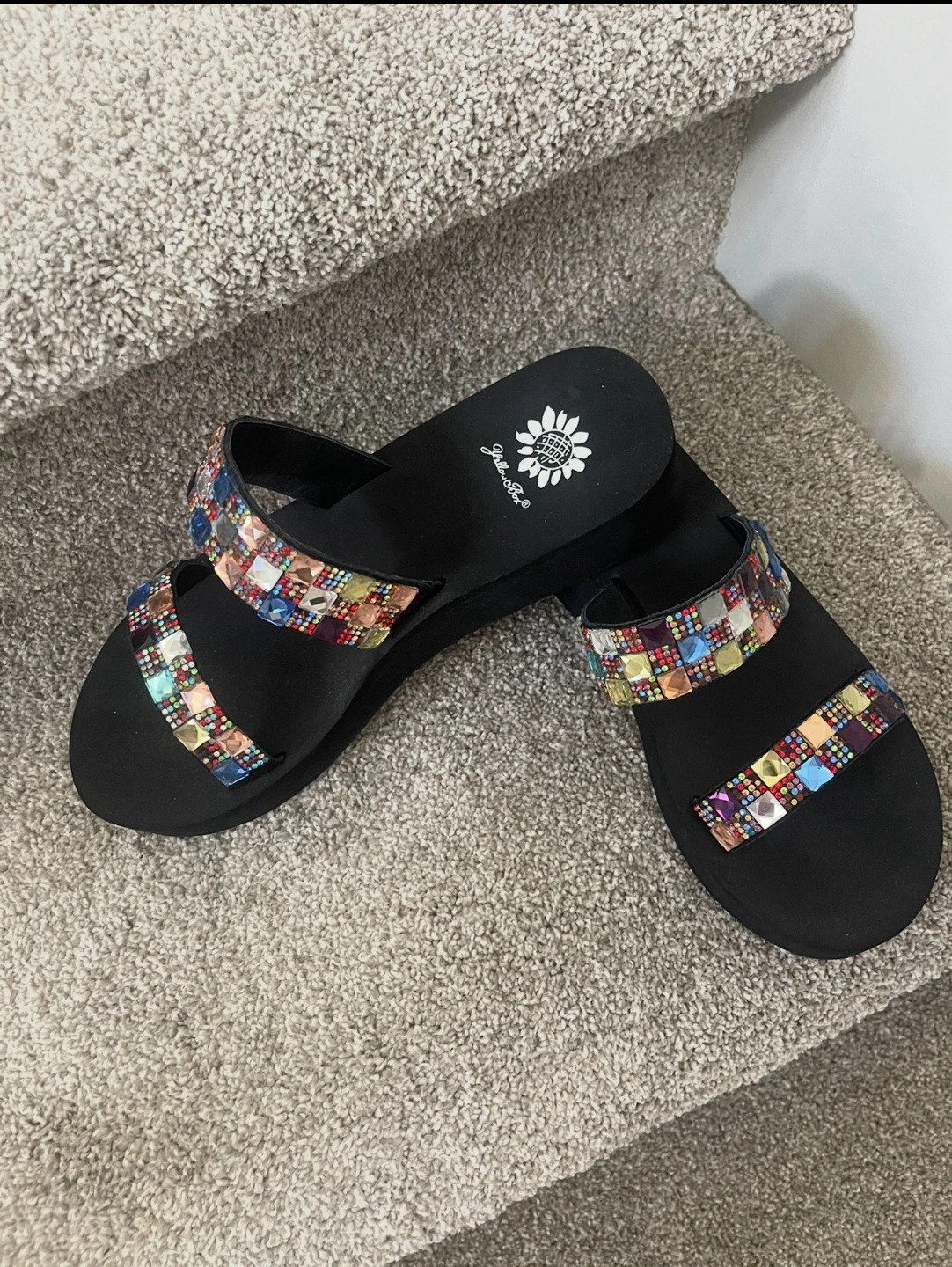 Cute Black YELLOW BOX sandals with colourful embellishments! They're in great shape and ready for a new home