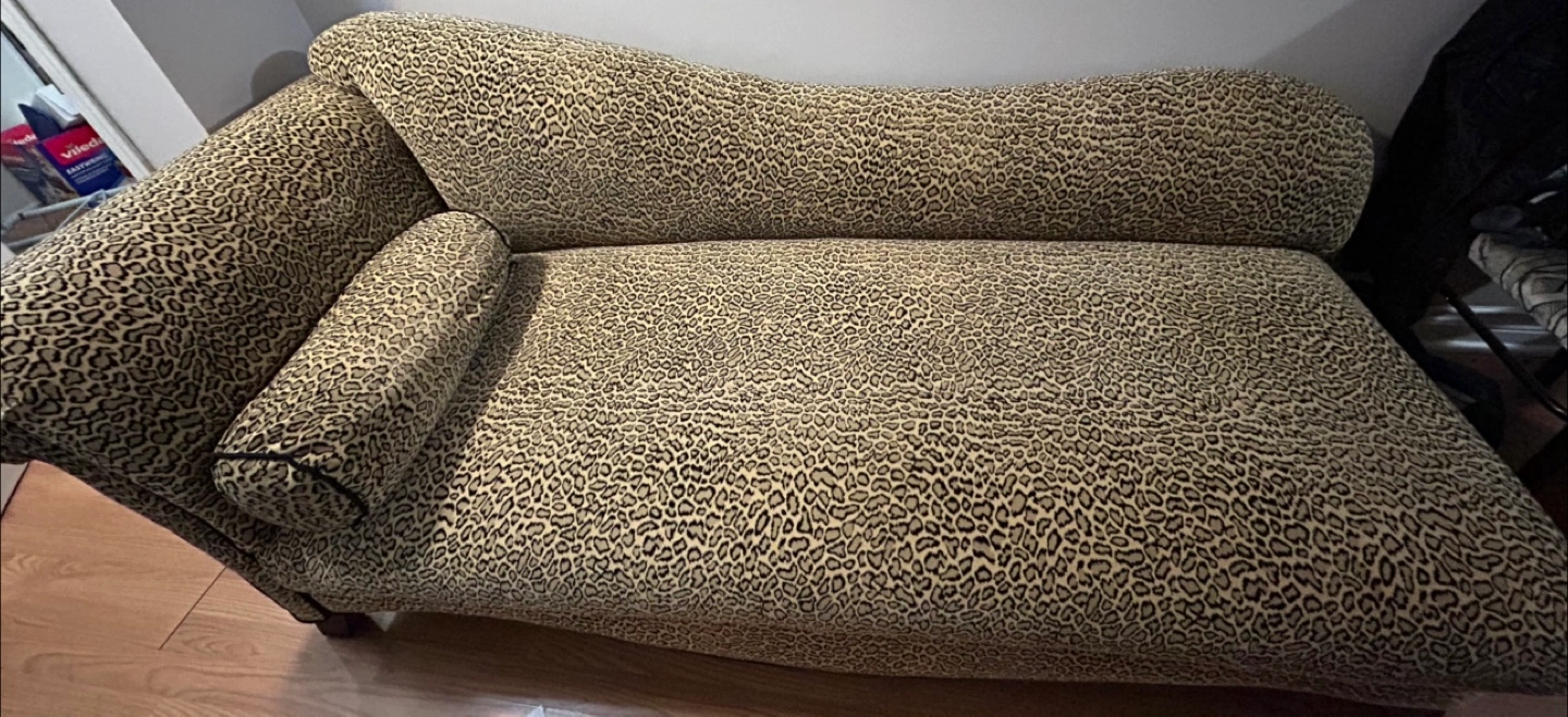 Selling a stylish chaise lounge with a unique leopard print pattern. It's in great condition and would add a fun touch to any living space!