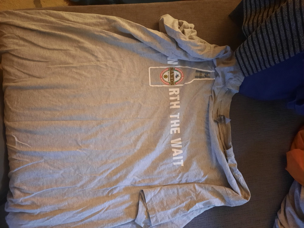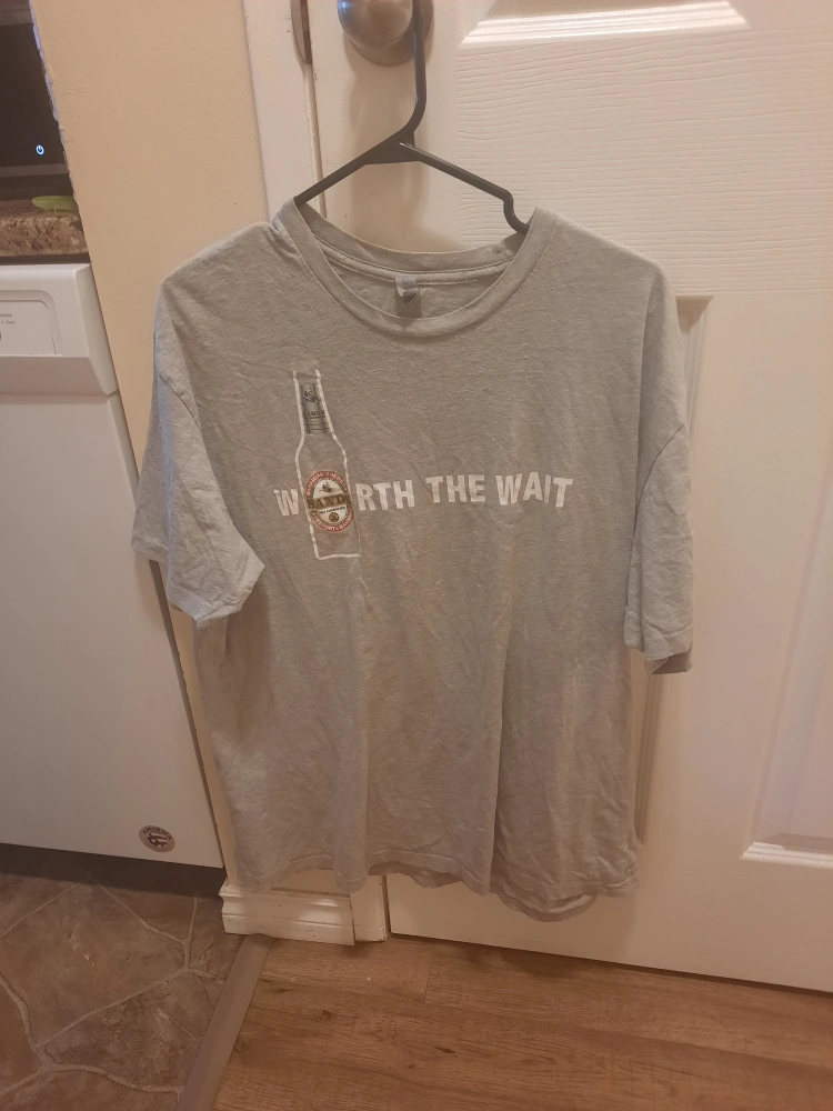 The image shows a grey t-shirt with a graphic on the front. The graphic is a bottle of beer next to the text "WORTH THE WAIT." $5.00