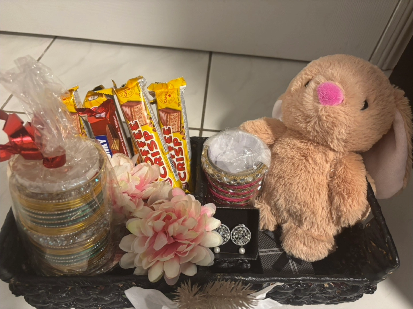 56A cute gift basket filled with goodies! It includes: - Coffee Crisp chocolate bars - A soft, cuddly bunny plush - A set of bangles - Earrings