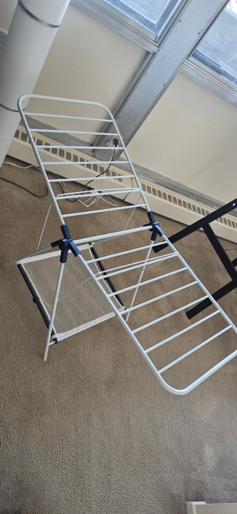 Selling a foldable clothes drying rack. It's white with blue accents and in good condition. Perfect for small spaces and easy to store when not in use