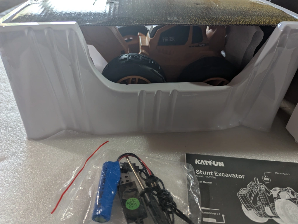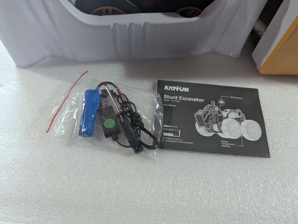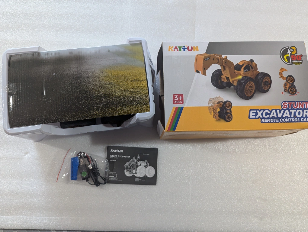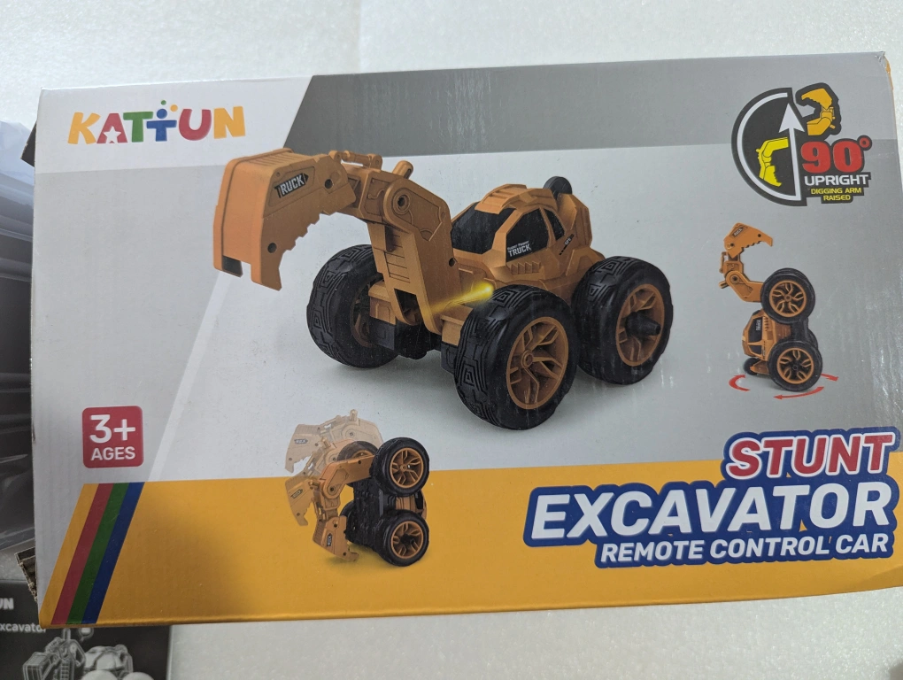Selling a brand new KATFUN Stunt Excavator Remote Control Car! It's still in the box and has never been used. It's recommended for ages 3+ and includes the battery pack, screwdriver, and user manual