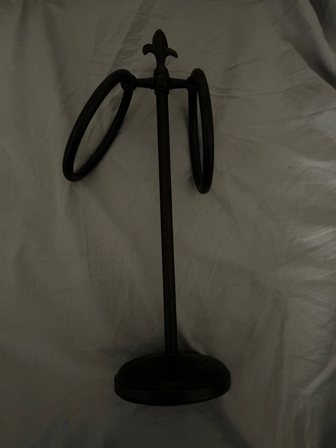 This is a black metal towel ring stand. It's perfect for a bathroom or kitchen to hang your towels. It's in great condition and ready for a new home