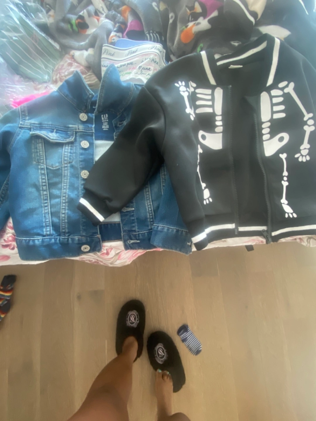 Selling a kids' size 4 black jacket with a white skeleton design $7. It's a fun and stylish piece for your little one! Also a Gap Jean Jacket size 2t $15 and a black and white fleece jacket for $7 it has a pink stain that can be removed when washed ... but all of them were barely worn