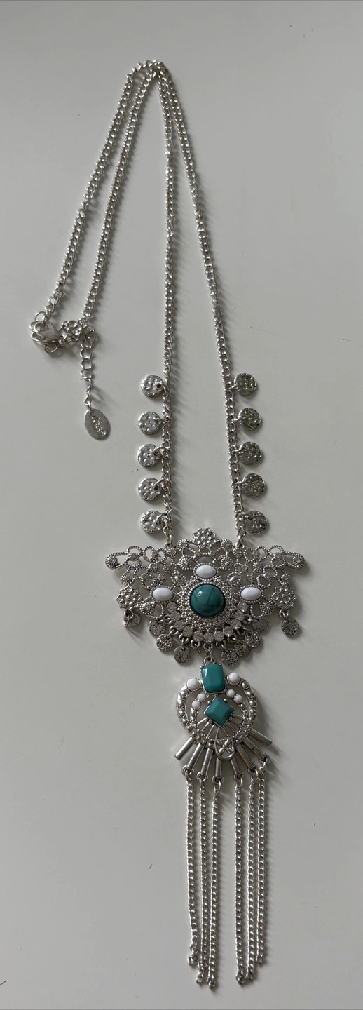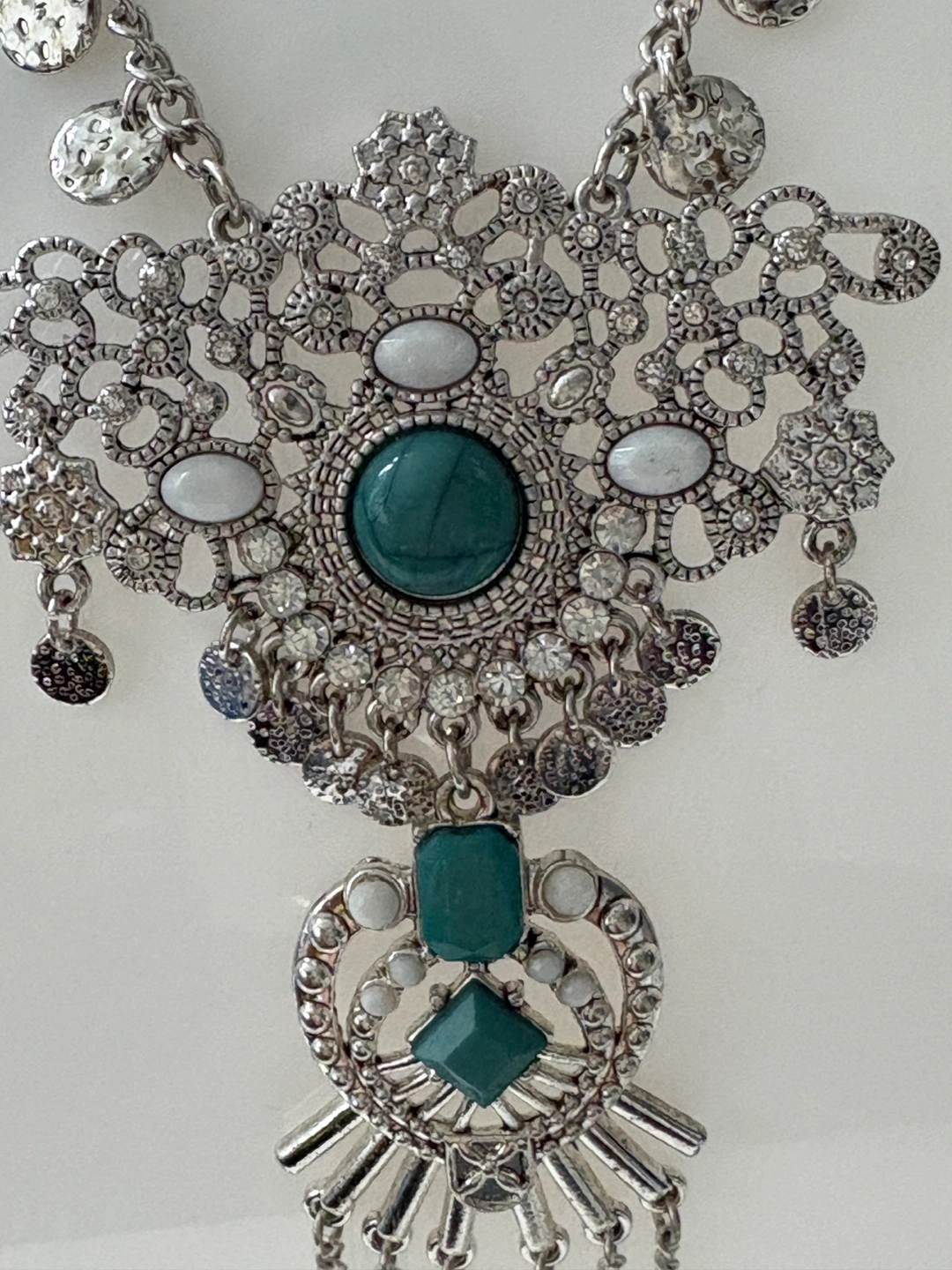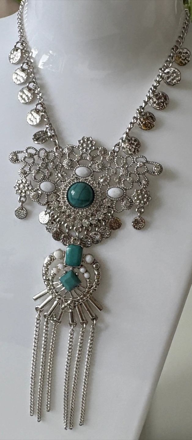 This is a beautiful silver-tone statement necklace. It features turquoise and white stone accents and a unique, eye-catching design. Perfect for adding a touch of bohemian flair to any outfit!