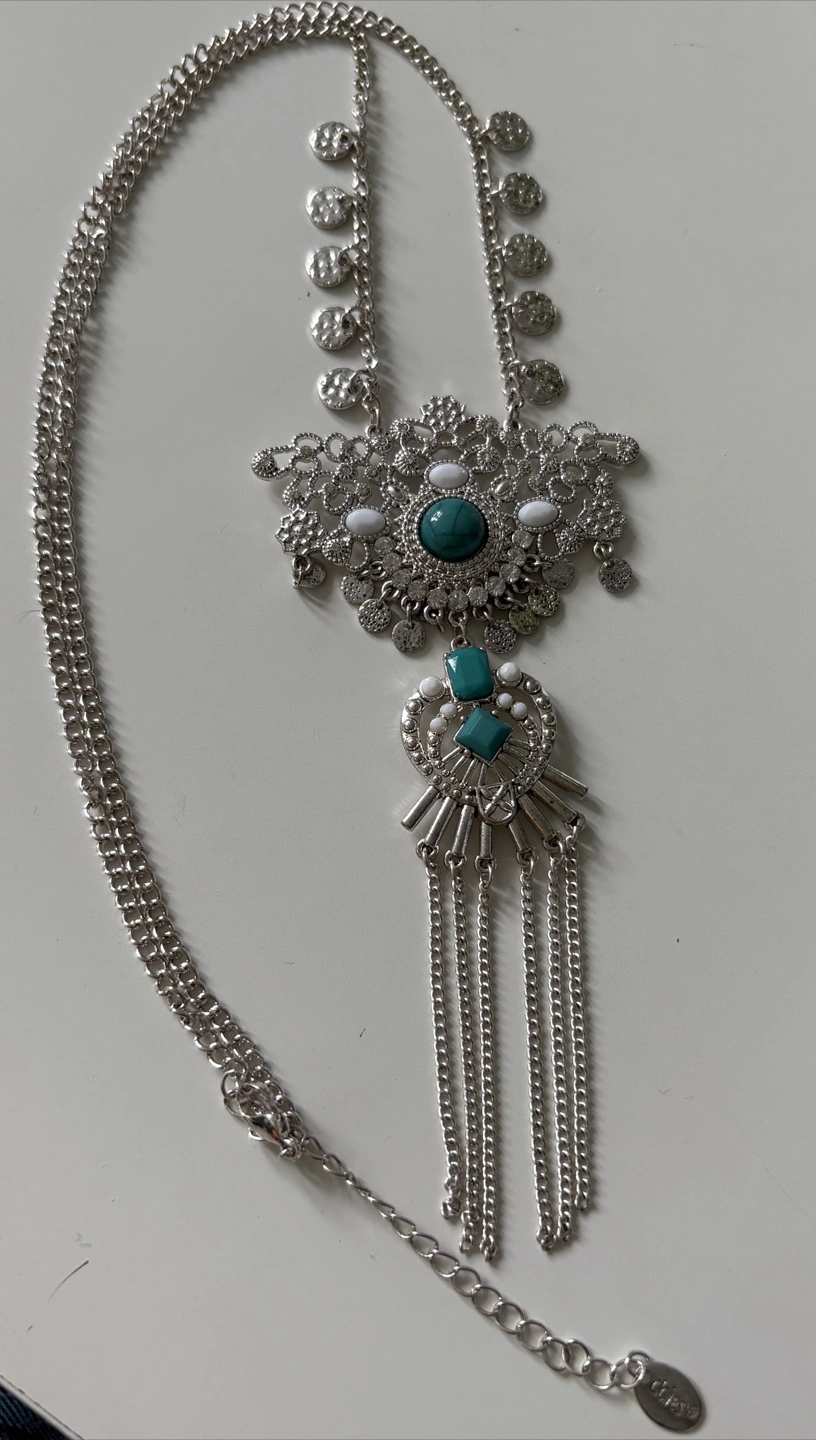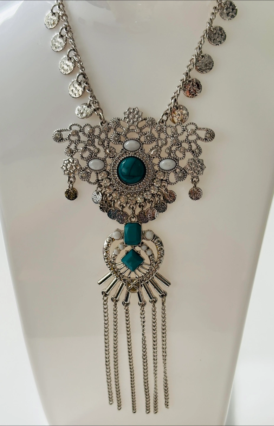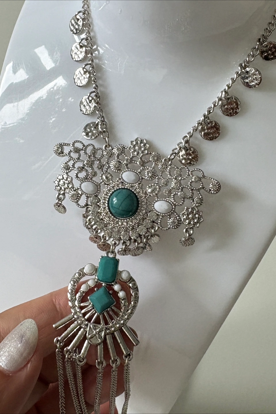 This is a beautiful silver-tone statement necklace. It features turquoise and white stone accents and a unique, eye-catching design. Perfect for adding a touch of bohemian flair to any outfit!