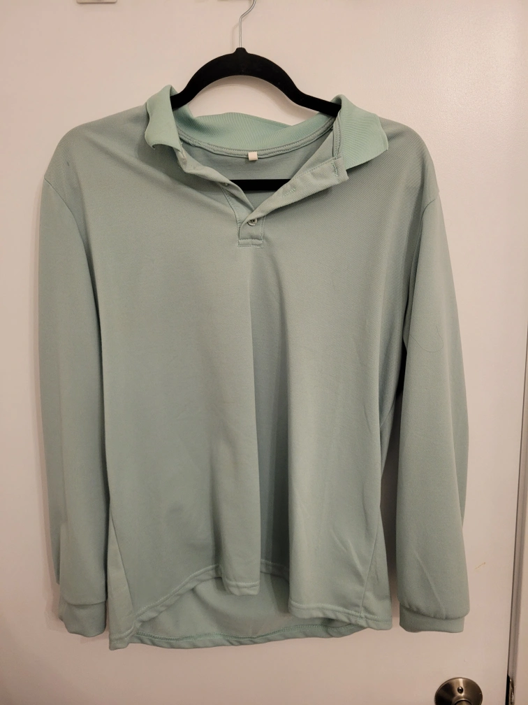 A comfy light green long sleeve polo shirt. It's in great condition and ready for a new home! Perfect for layering or wearing on its own.