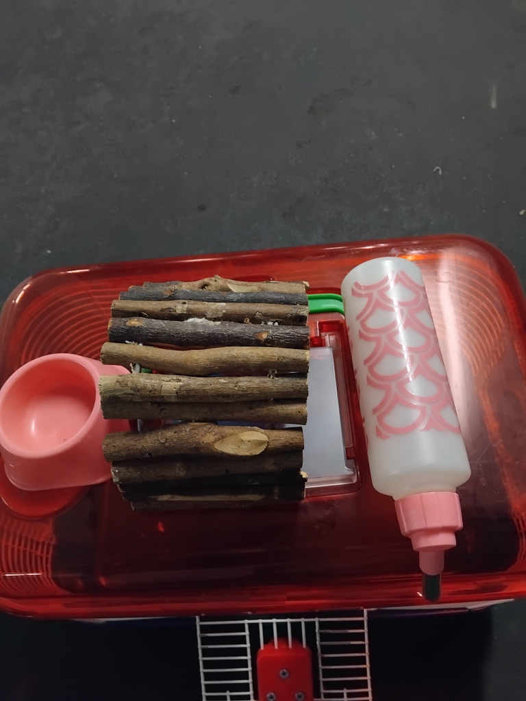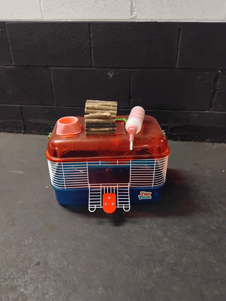 Selling a hamstercahe It comes with a wheel, water bottle, food dish, and wooden hut