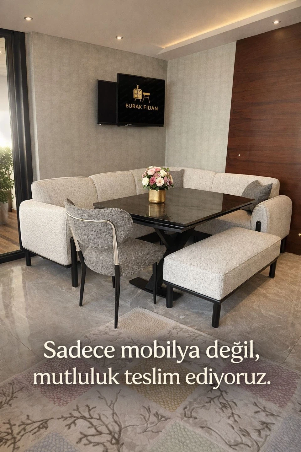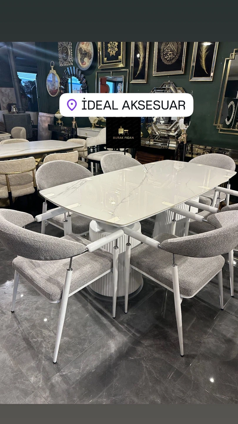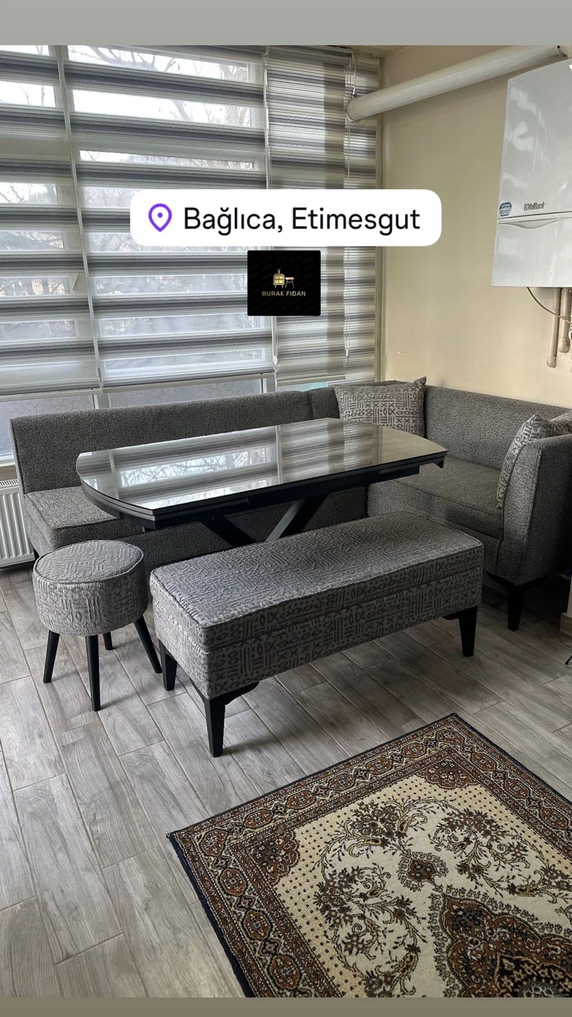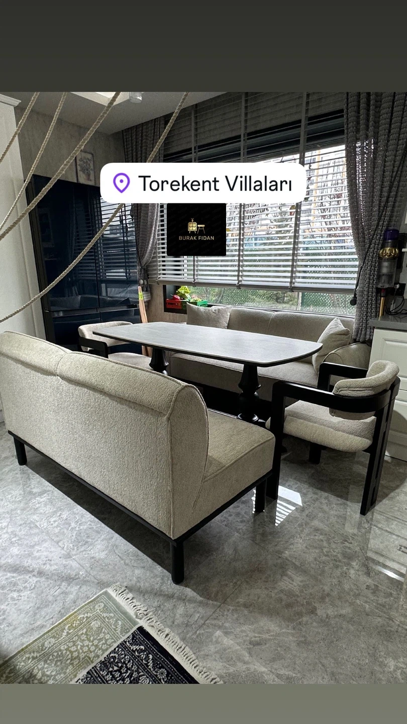 This modular dining set features a comfortable U-shaped sofa with upholstered seating and backrests, a stone-look tabletop, and accompanying upholstered chairs and benches. It's designed to maximize seating in a dining area. The set includes multiple seating options, a spacious table, and complementary benches and stools, making it a versatile choice for gatherings.