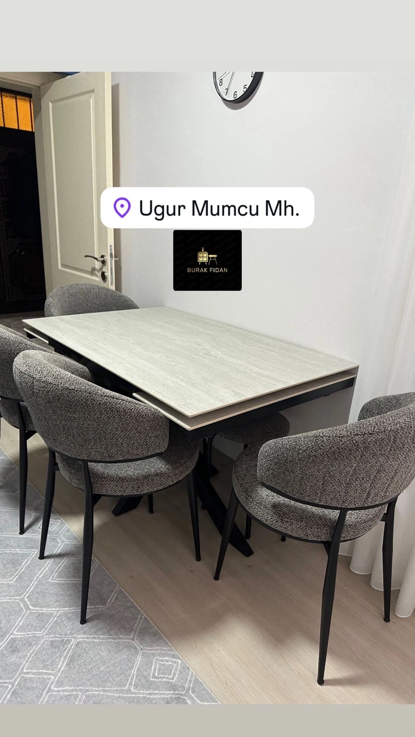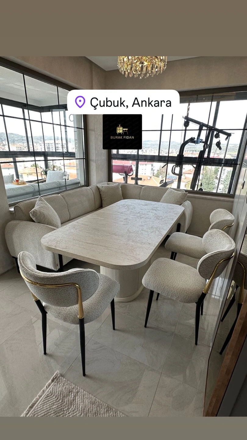 This modular dining set features a comfortable U-shaped sofa with upholstered seating and backrests, a stone-look tabletop, and accompanying upholstered chairs and benches. It's designed to maximize seating in a dining area. The set includes multiple seating options, a spacious table, and complementary benches and stools, making it a versatile choice for gatherings.