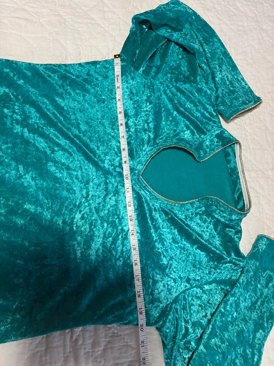 This is a teal crushed velvet kurti. It measures approximately 38 inches in length. The material is soft and textured with gold trim accents.