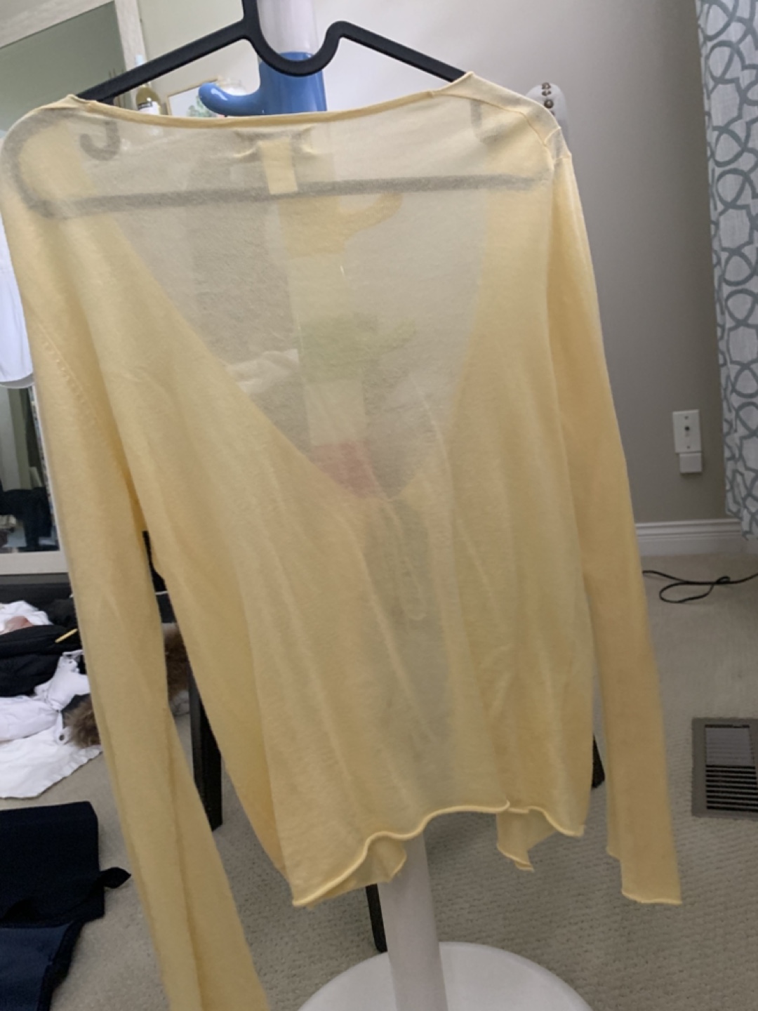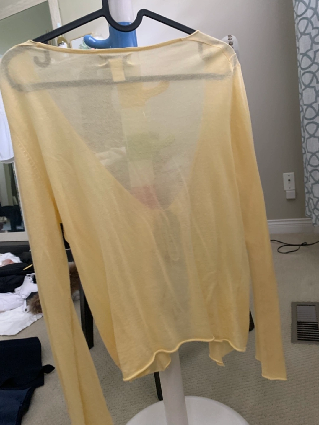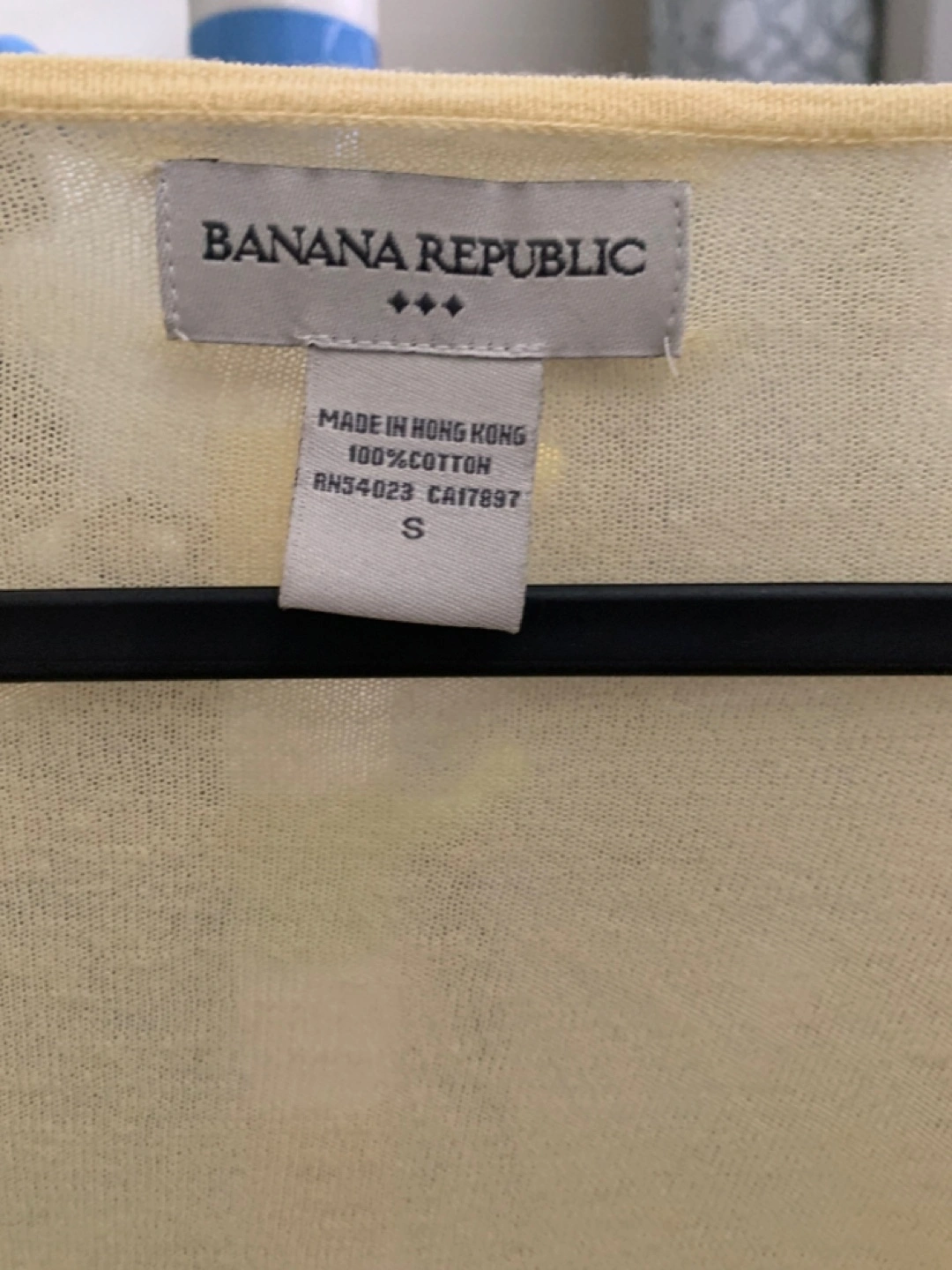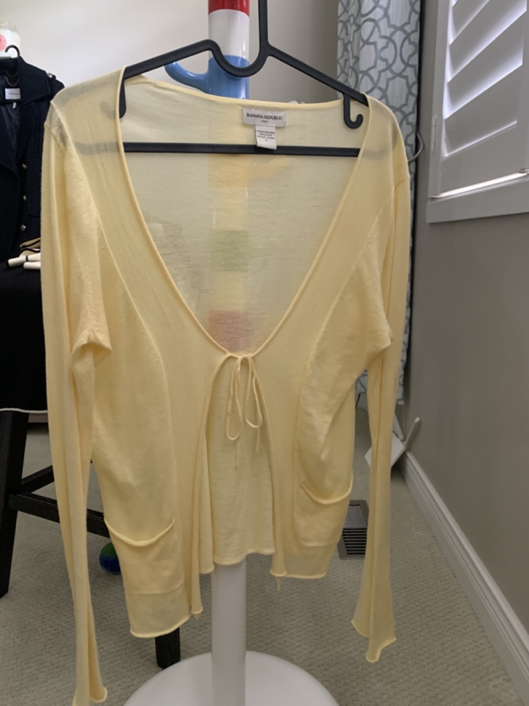 A lovely, light yellow cardigan from Banana Republic! It's made of 100% cotton and is a size small. Perfect for layering on those cooler days!