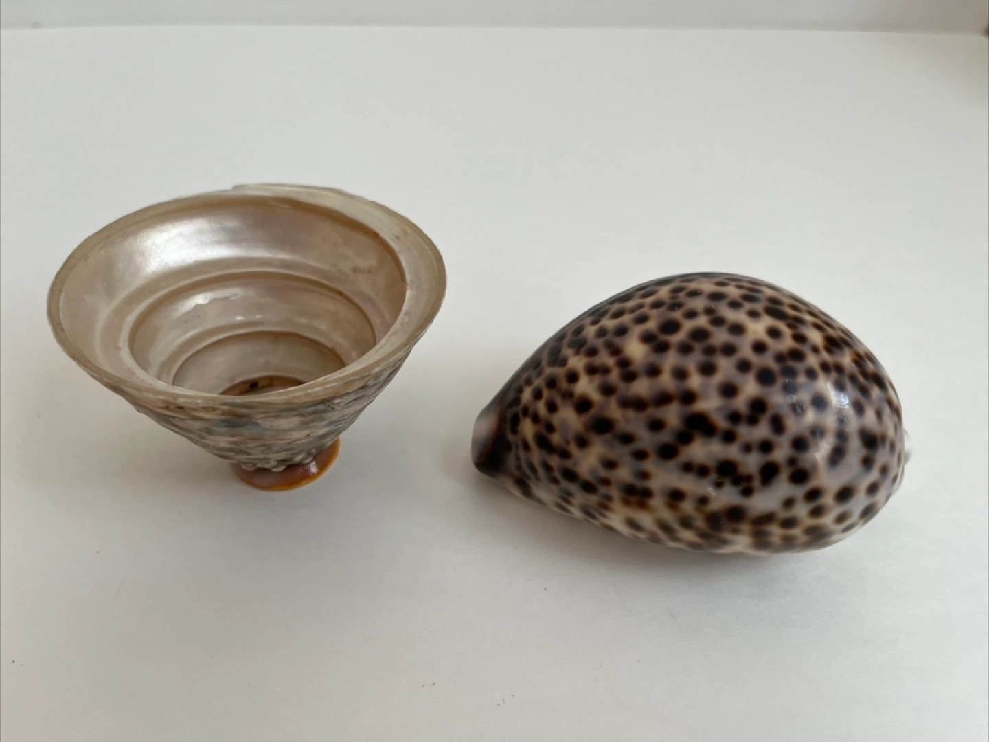 This decorative shell set includes two unique pieces, perfect for adding a touch of coastal charm to your decor. The first is a cut and polished conch shell transformed into a small decorative vase. The second piece is a polka-dotted snail shell which is ideal as a paperweight or decorative accent. Each piece is about 2-3 inches wide and 1.5 inches high. Both shells are in excellent condition with no damage. Listed price is for both items. If the ad is up, it's available!