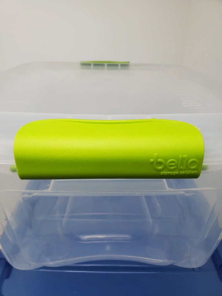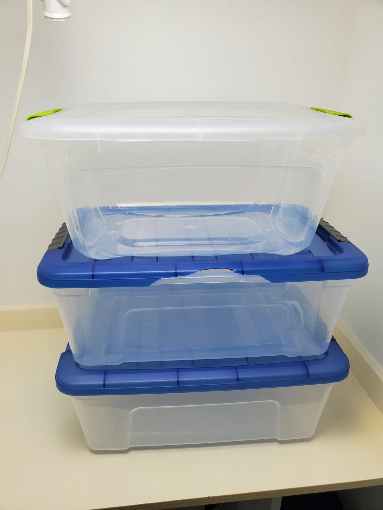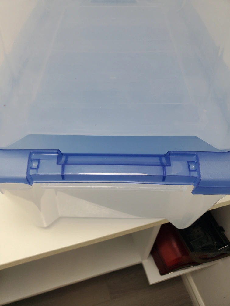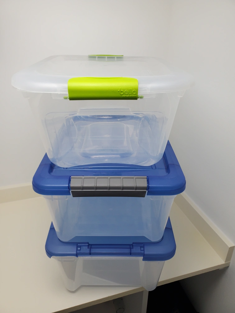 Selling a stack of Small storage bins! Great for organizing your space. There are three bins in total, in varying sizes. The colours are clear and blue. One lid has a crack on the side (shown in pictures) and one lid is missing the latch. They are in over all good condition. Selling altogether.