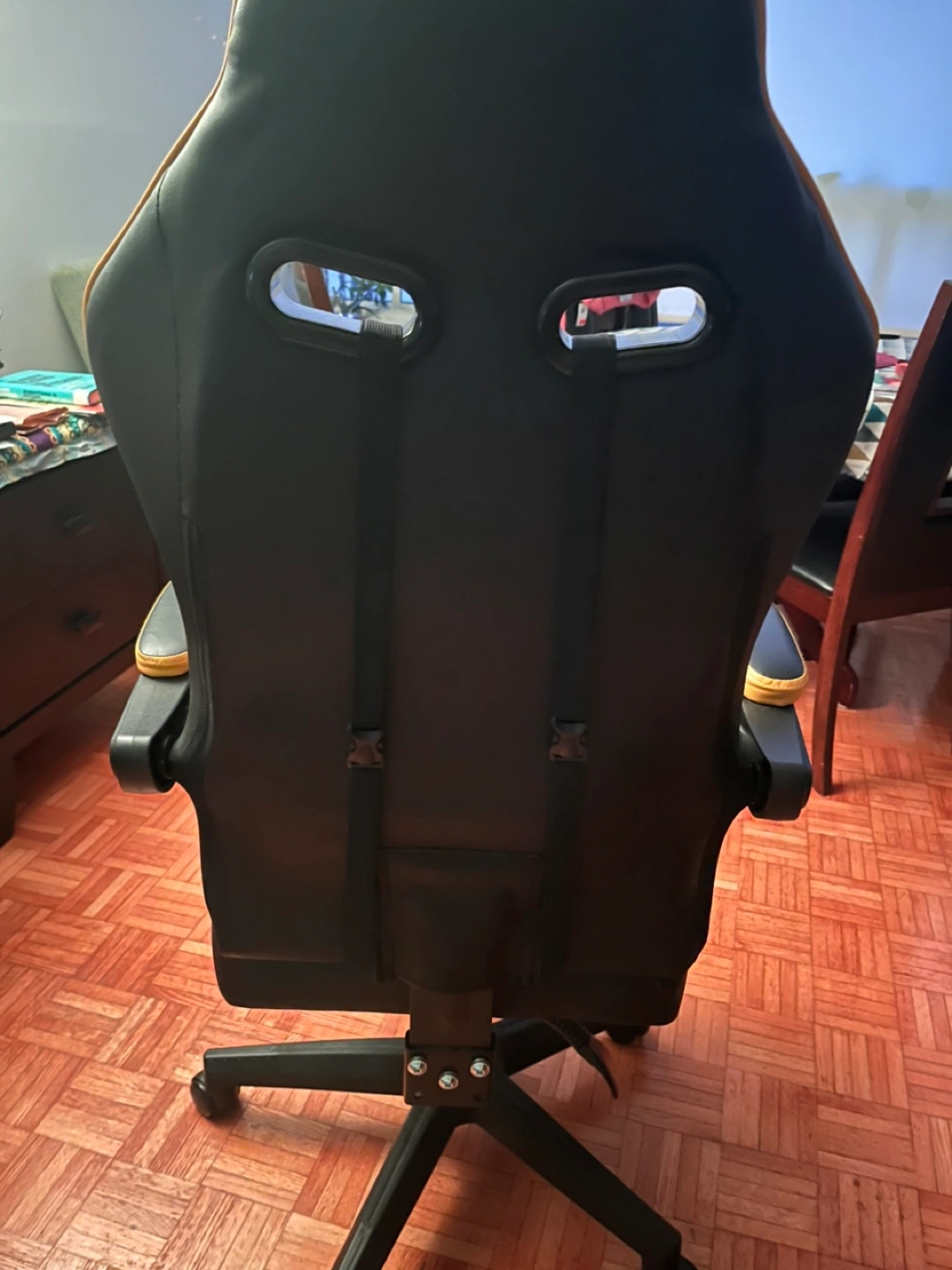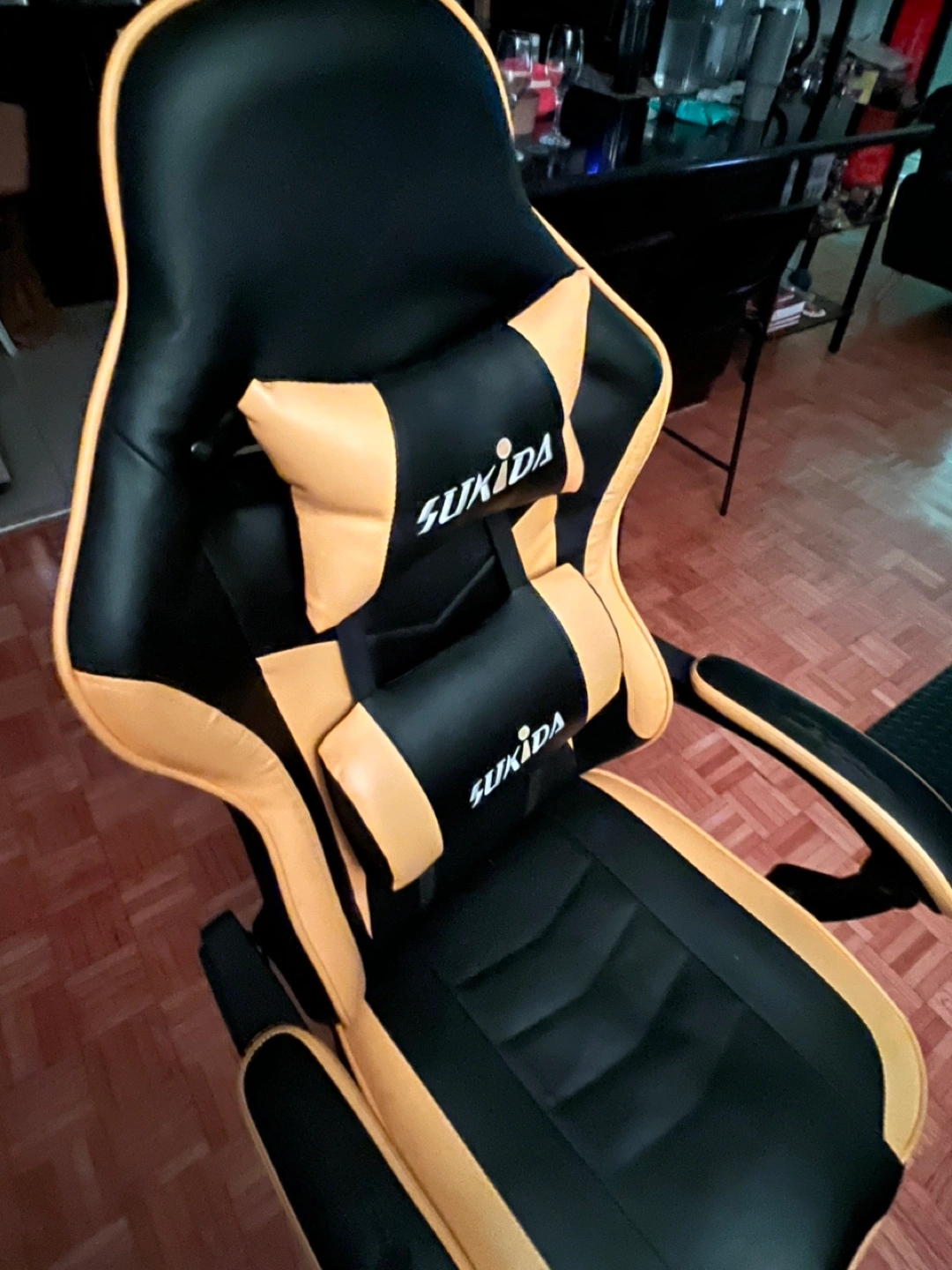 Selling a Sukida gaming chair in black and gold. It's in great shape and super comfy for long gaming sessions or working from home! The chair features a headrest and lumbar support for added comfort. It comes with additional leg rest extension and lumber support massager which runs with usb.