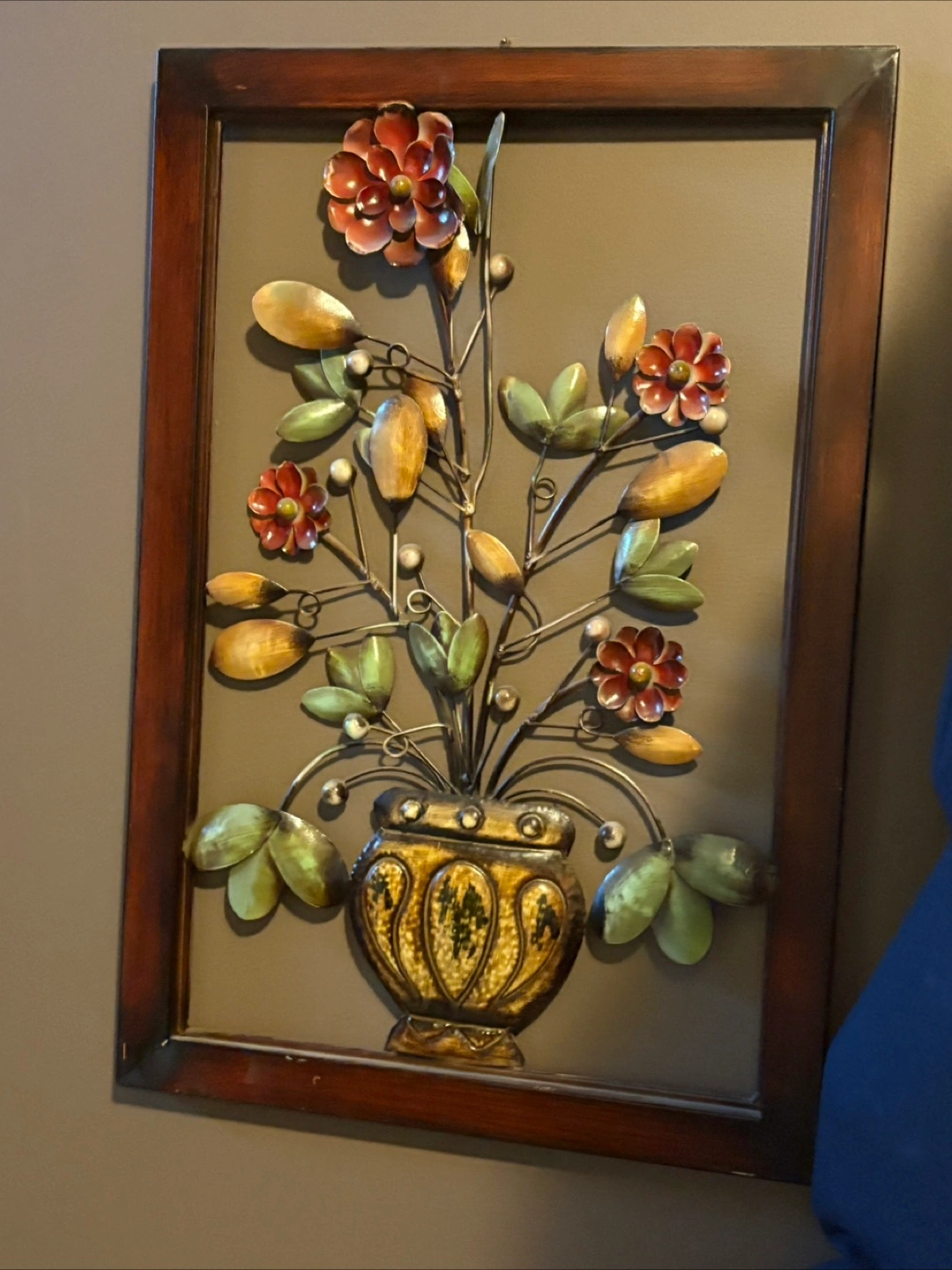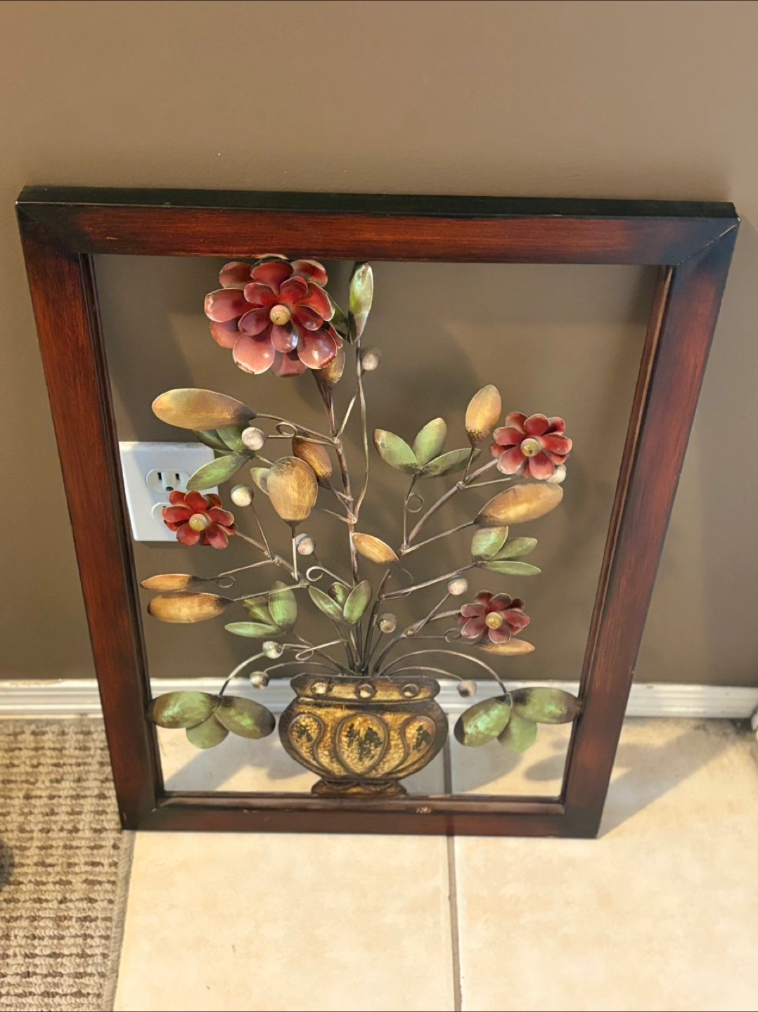 Add a touch of floral charm to your home with this framed metal flower wall art! The piece features a vase with flowers and leaves in a framed setting. It's in great condition and ready to brighten up any room in your home