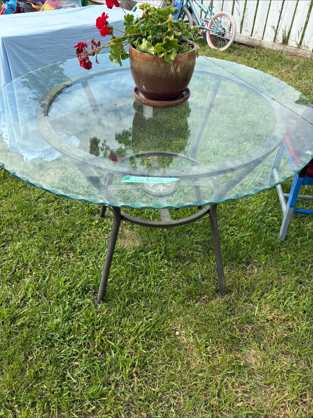 Selling a glass top outdoor table! It's in good condition and ready for your patio or garden. The table has a metal frame and a clear glass top. The top has a beautiful edging to it. Pick up in Forest lawn FCFS.