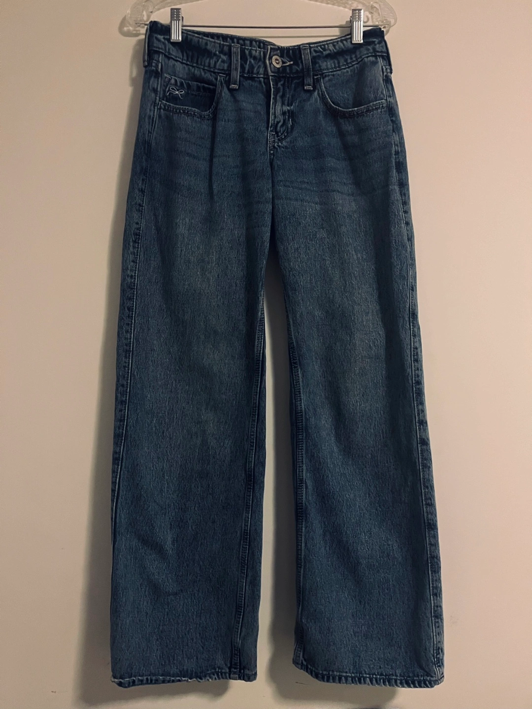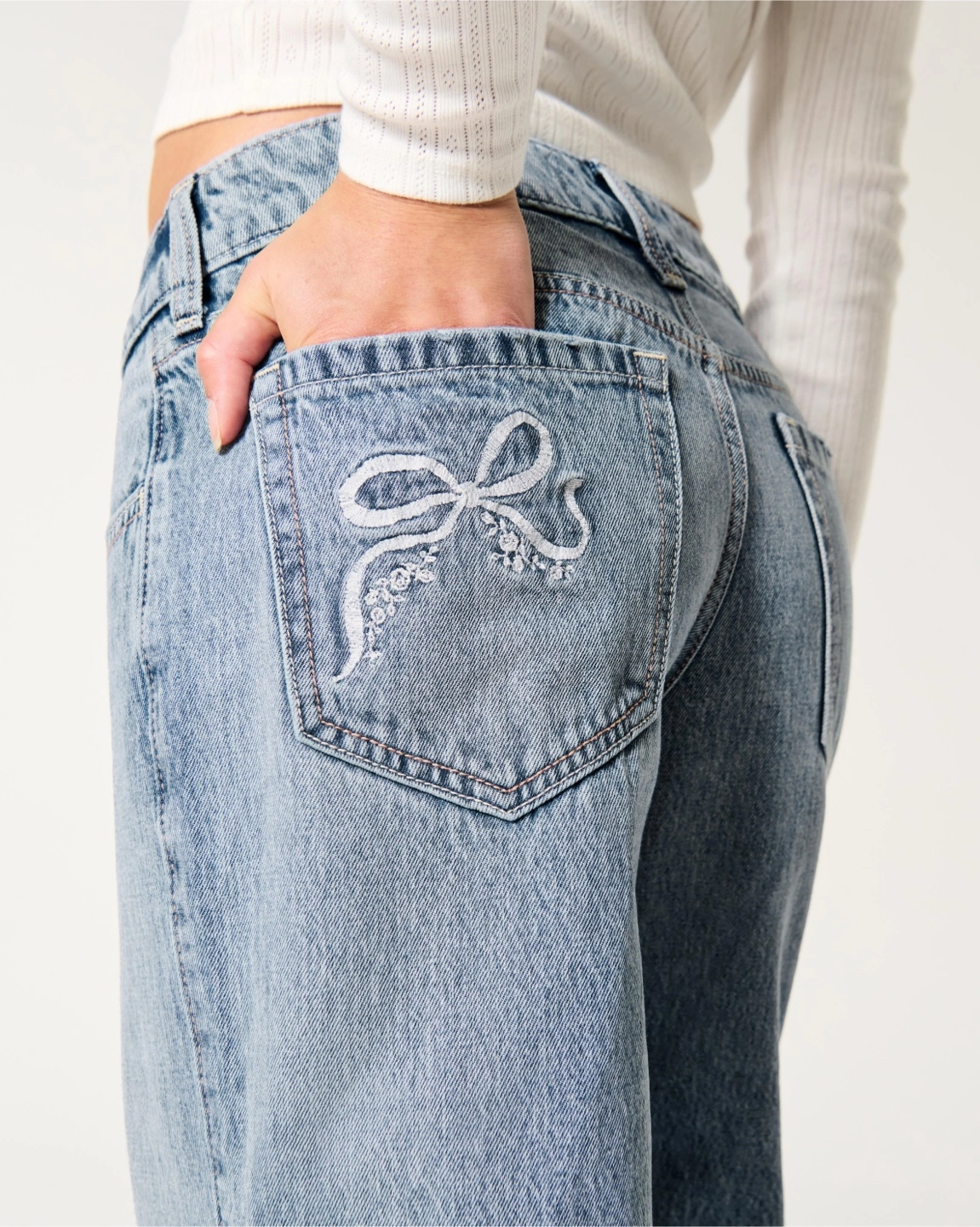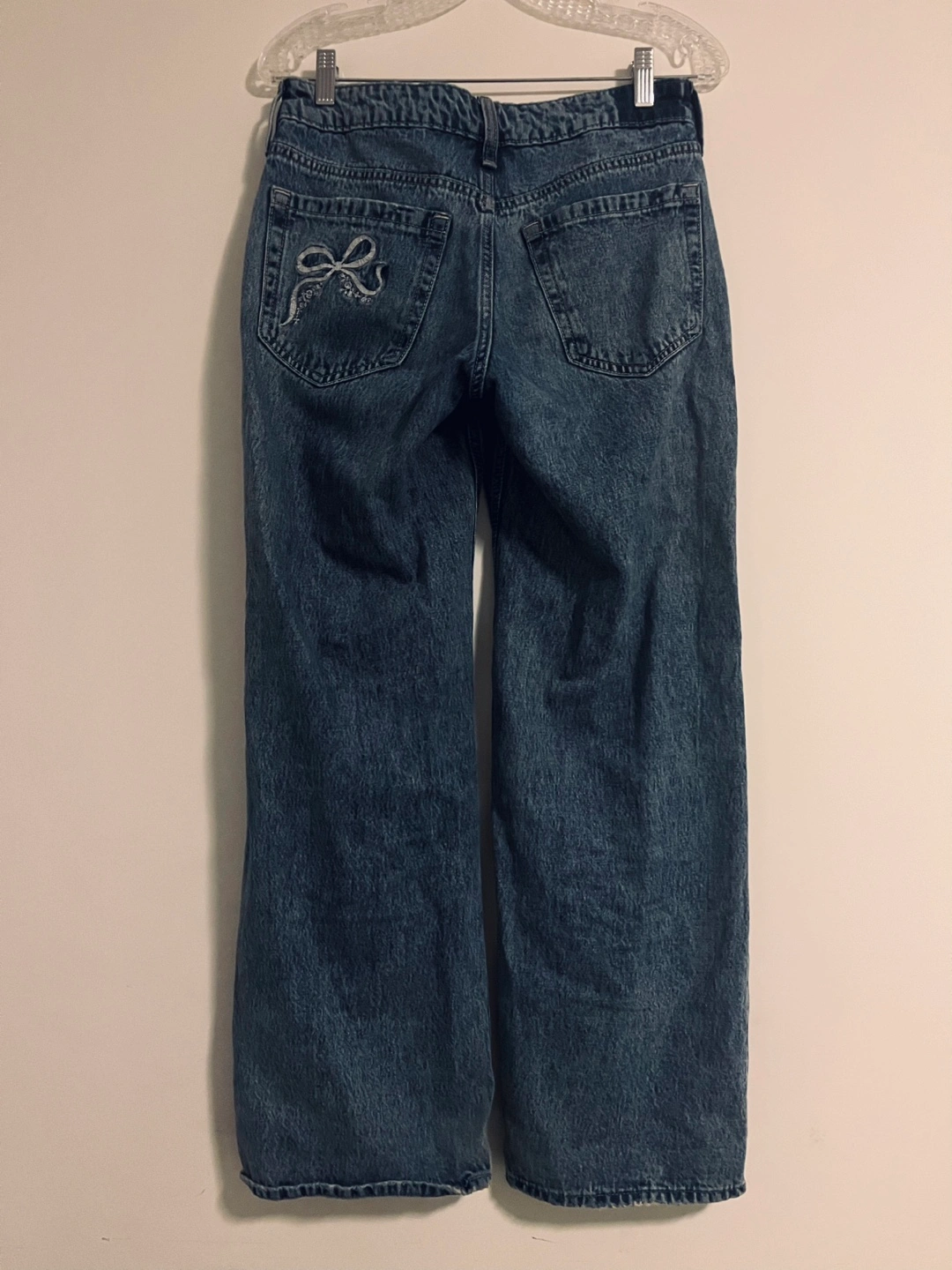 Super cute Hollister Low-rise Medium Wash Embroidered Bow Baggy Jeans. Size 02 or 25 inches. Limited Edition! 🎀