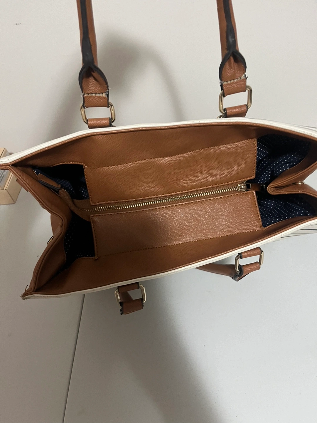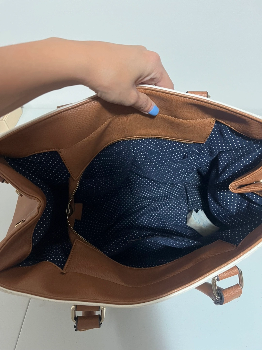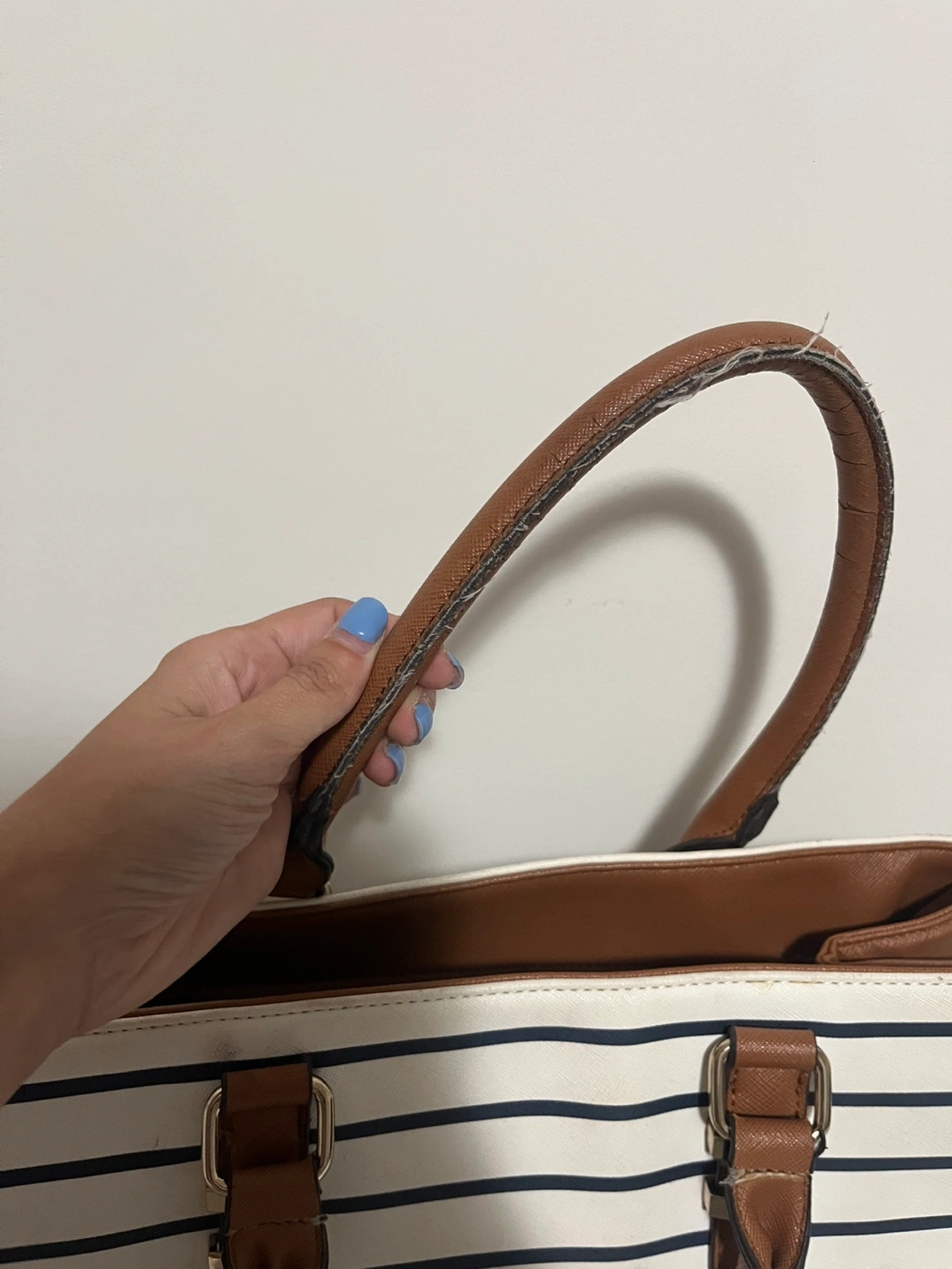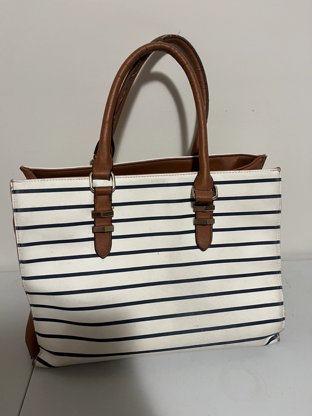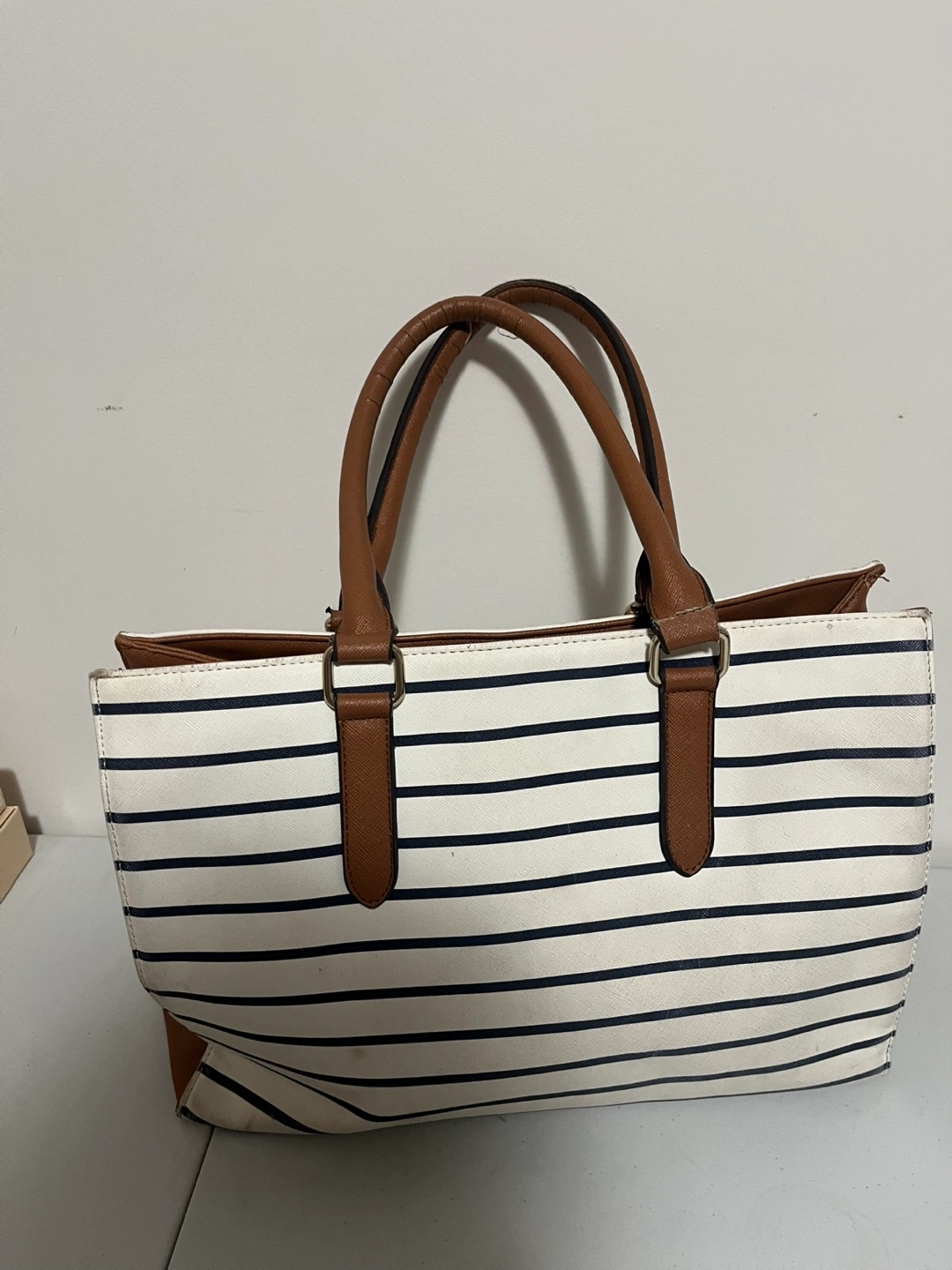 90Selling a tote bag with a white and navy striped pattern! It has brown handles and trim. The interior is lined with a navy blue and white polka dot fabric and features a zippered pocket. The handles show some signs of wear, but otherwise it's in good condition