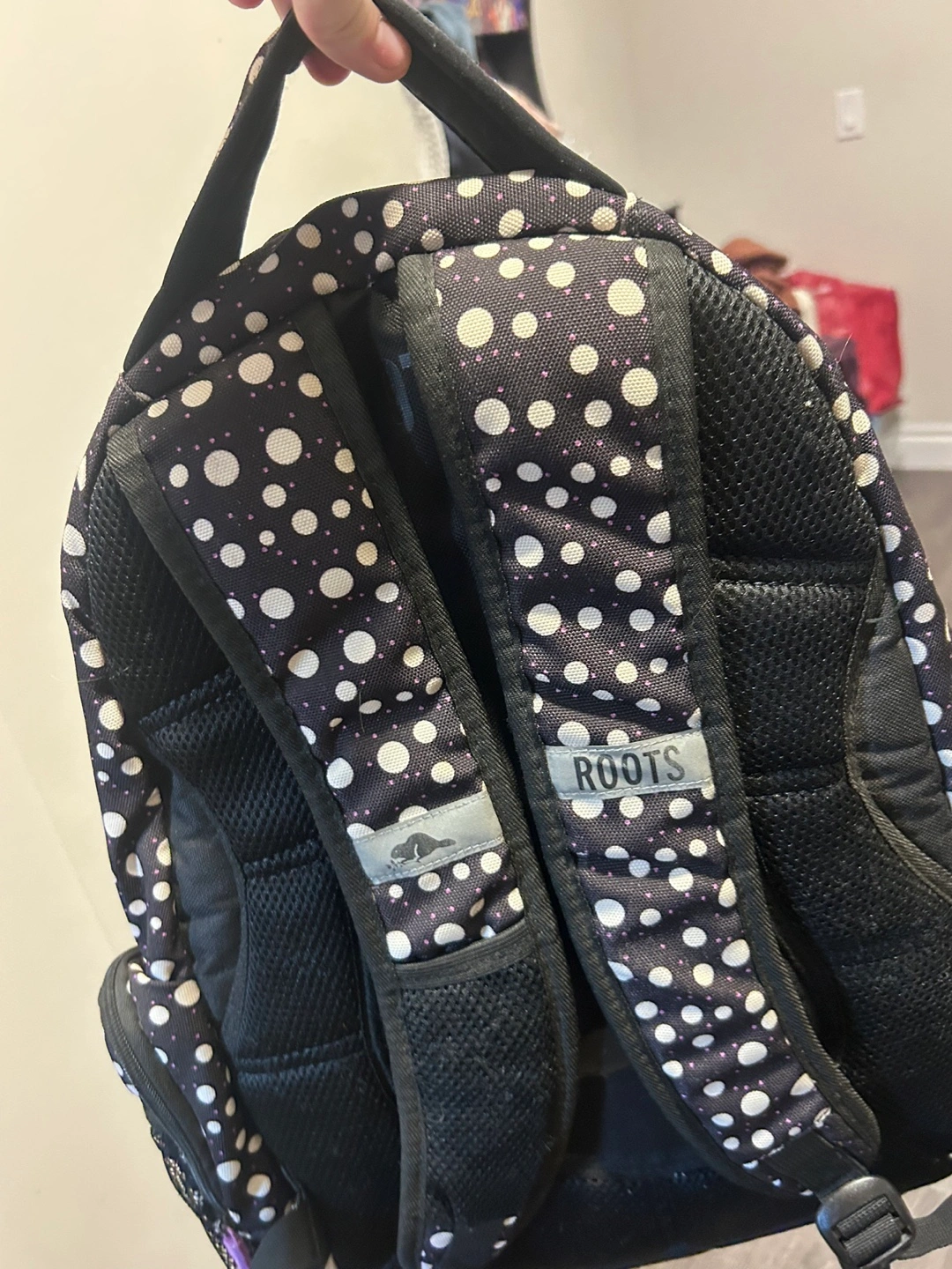 Selling a Roots backpack with a black and white polka dot pattern and purple accents! It's in great shape and has lots of compartments for storage