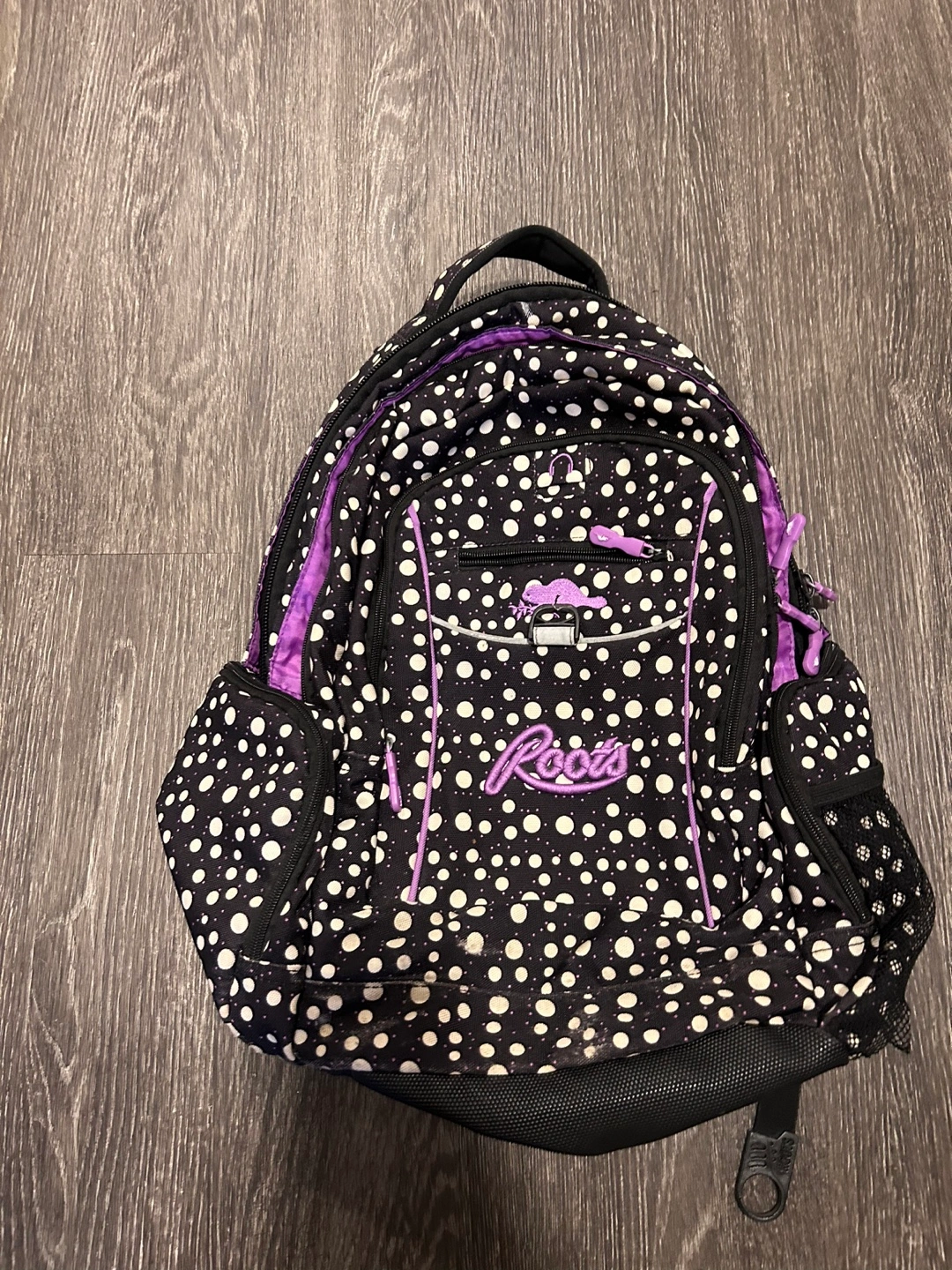 Selling a Roots backpack with a black and white polka dot pattern and purple accents! It's in great shape and has lots of compartments for storage