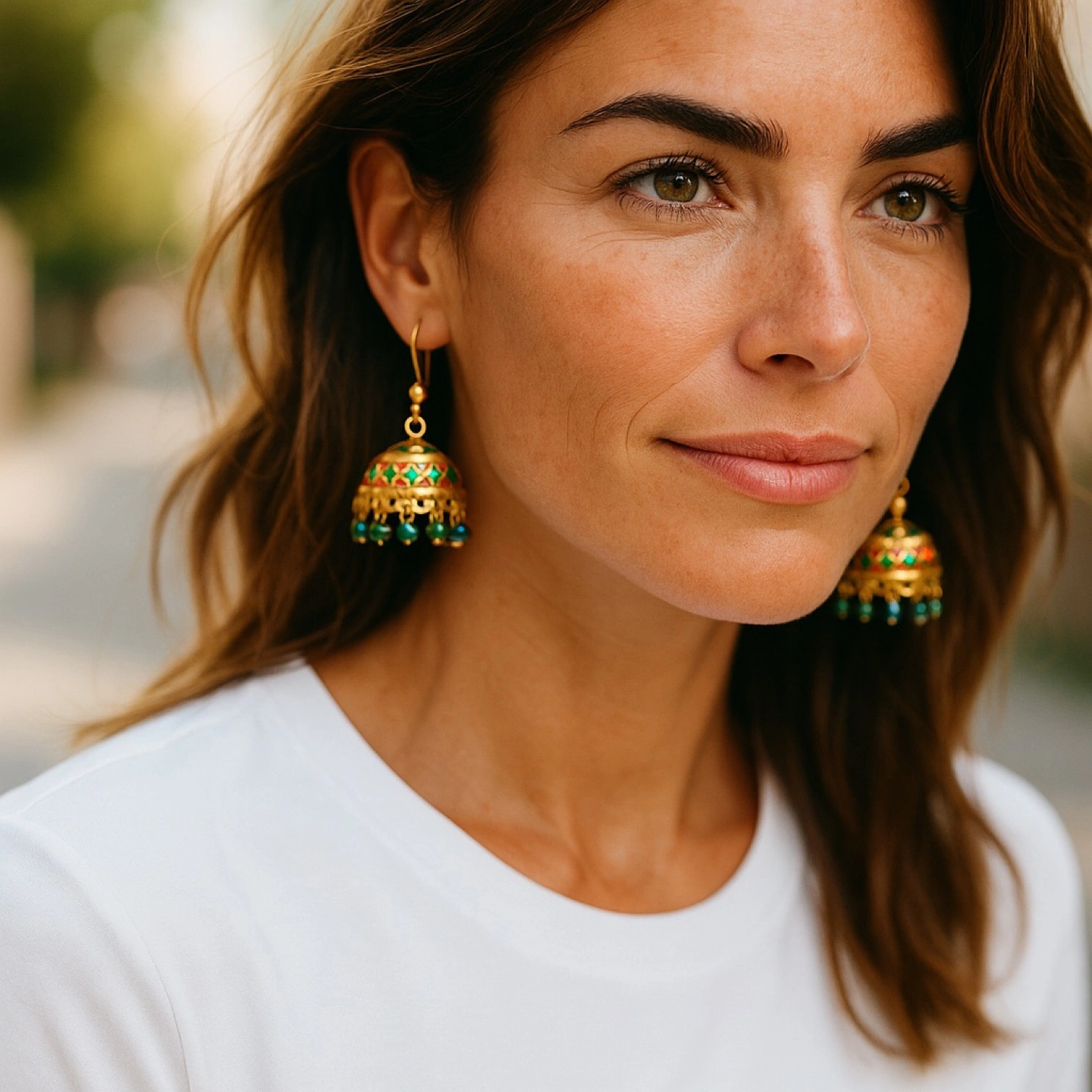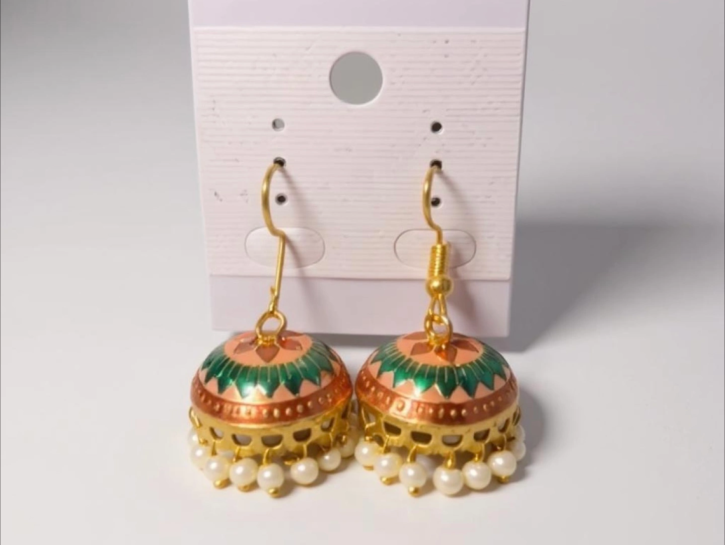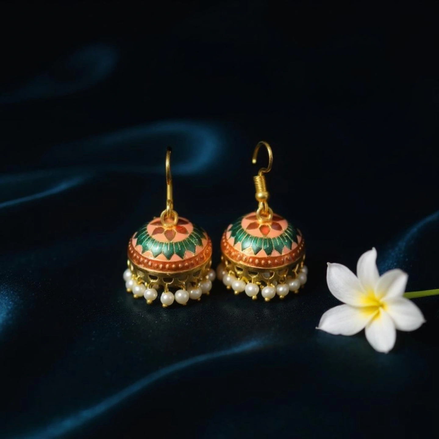These are a pair of beautiful Jhumki earrings, showcasing a traditional Indian style. They feature intricate enamel work in shades of green and peach, complemented by delicate pearl accents. Perfect for adding a touch of cultural flair to any outfit! Size may vary.