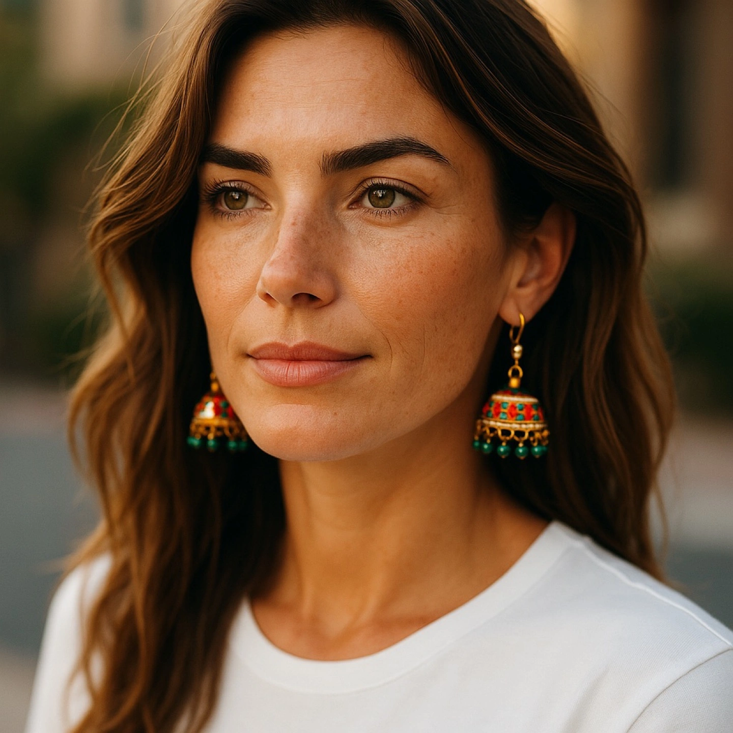 These are a pair of beautiful Jhumki earrings, showcasing a traditional Indian style. They feature intricate enamel work in shades of green and peach, complemented by delicate pearl accents. Perfect for adding a touch of cultural flair to any outfit! Size may vary.
