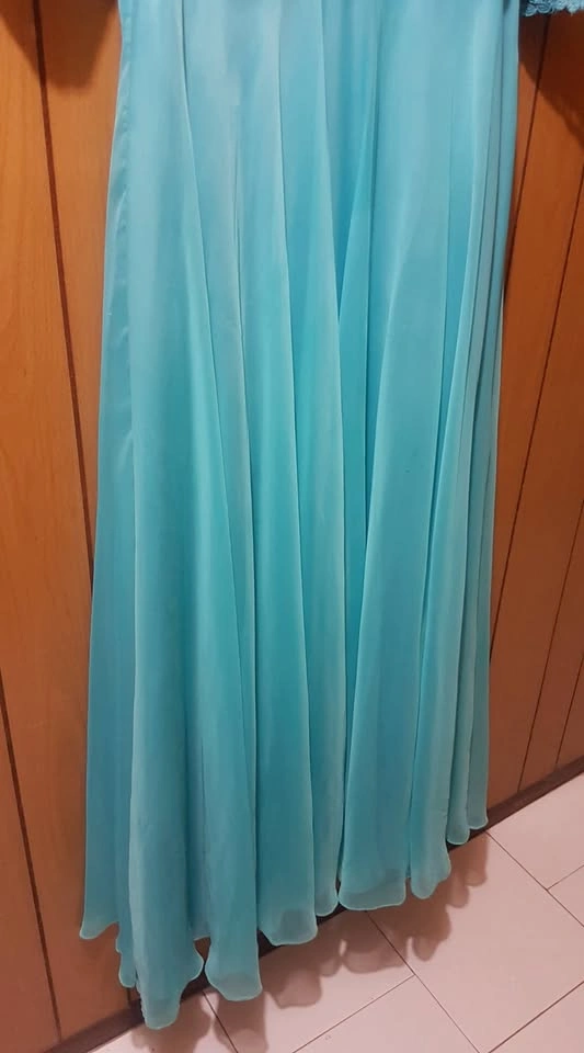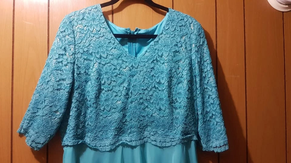 Appropriate for Prom, attending a wedding, and any other occasion. Blue A-line Gown dress with beautiful blue bodice. Top of gown has a blue floral knit with 3/4 length sleeves. Bottom of gown has soft silky flow that does not lose its shape.