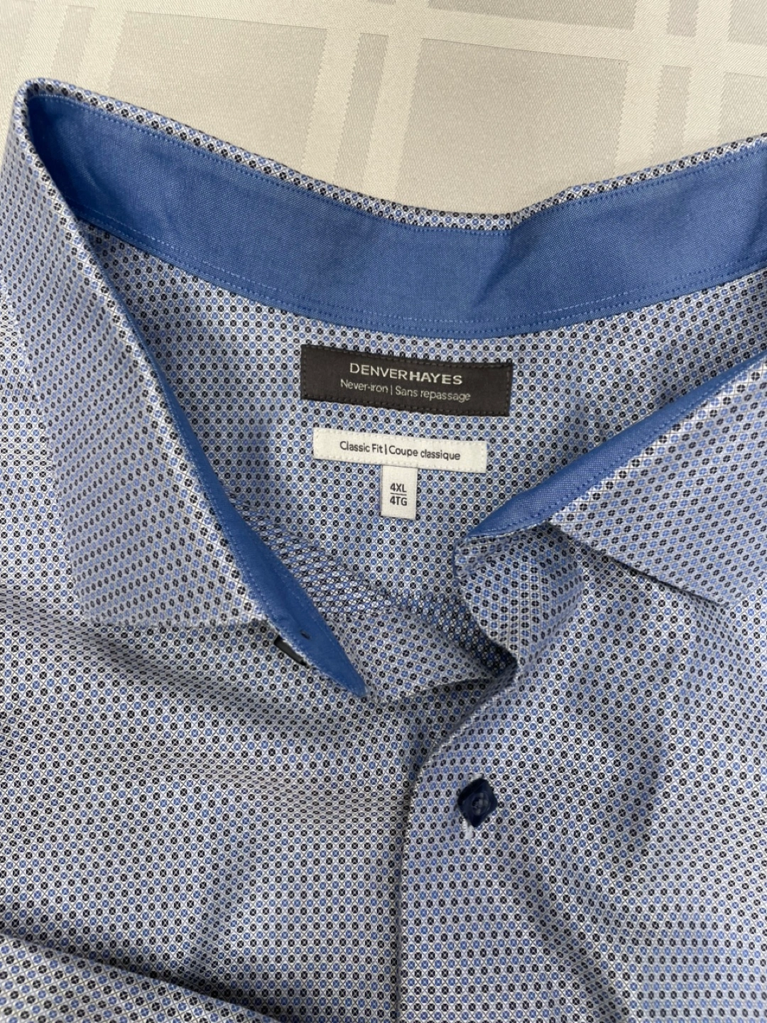 Looking to sell a Denver Hayes dress shirt in size 4XL. It's a classic fit and has a nice blue pattern. This shirt is also wrinkle-resistant, so it's easy to care for!