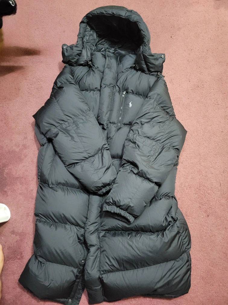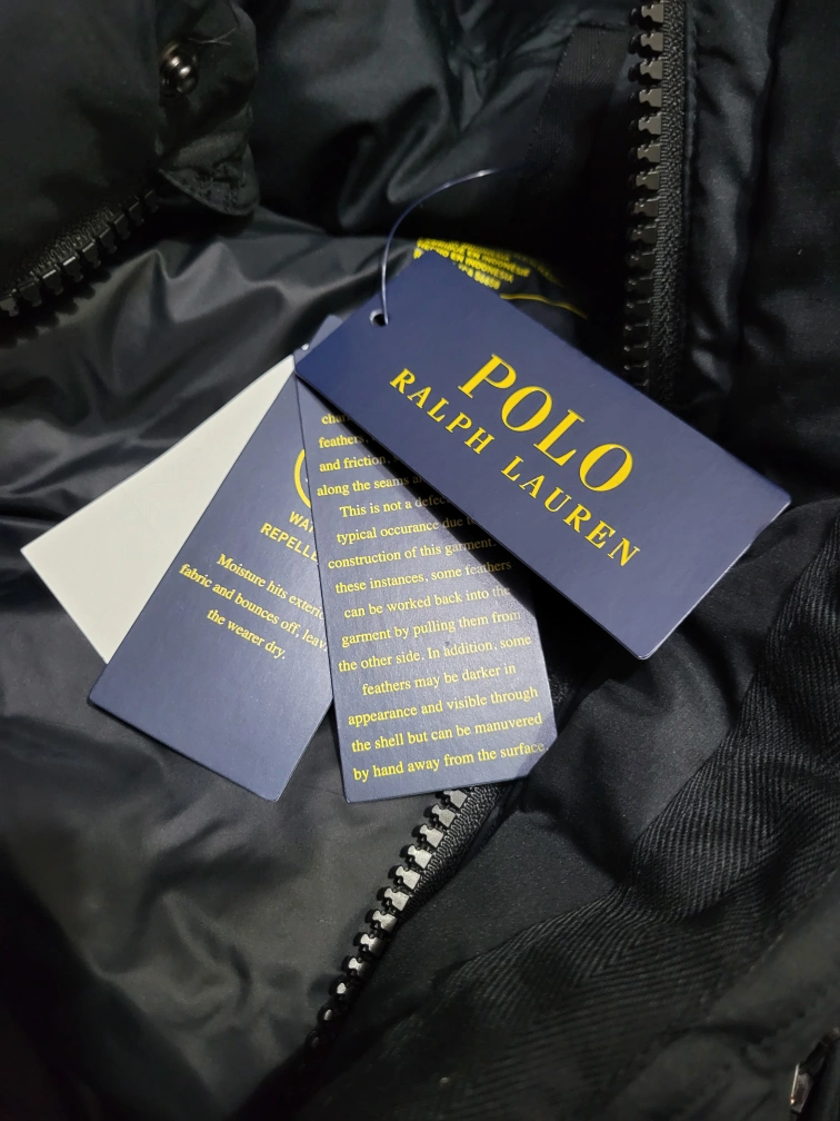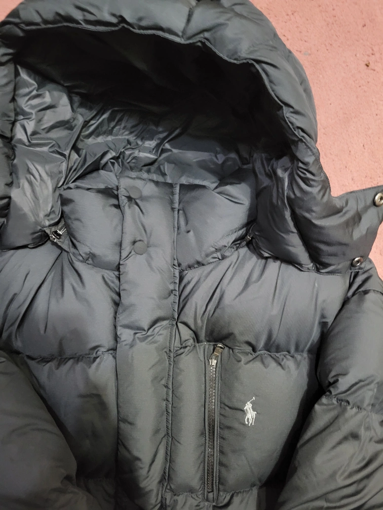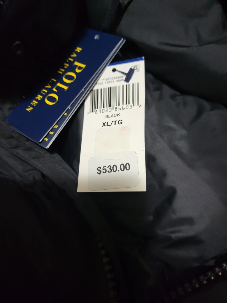 Here's a Ralph Lauren puffer jacket in size XL. It's black and in great condition and it's new.The original tag is still attached, showing it was originally bought for $530.