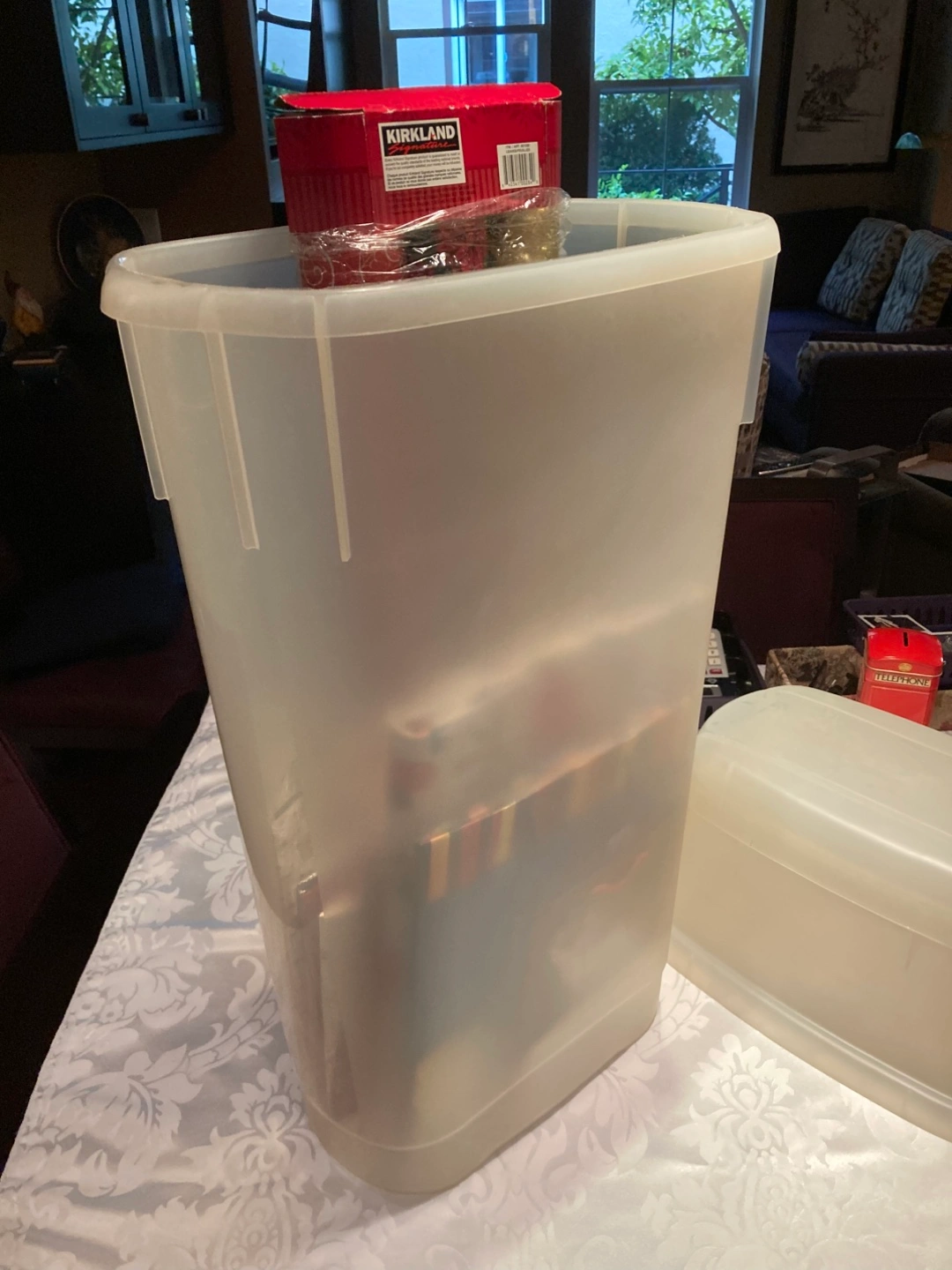 240I'm selling a sturdy plastic gift wrap storage bin. Perfect for storing full size rolls of wrapping paper in the base. The top lifts up and provides a separate area to store ribbons, bows, tape, scissors, etc. Comes with several rolls of Christmas wrappingpaper (Costco Kirkland brand) and additional sheets of wrapping paper, etc.