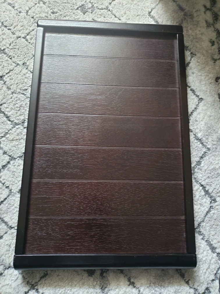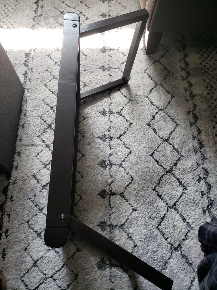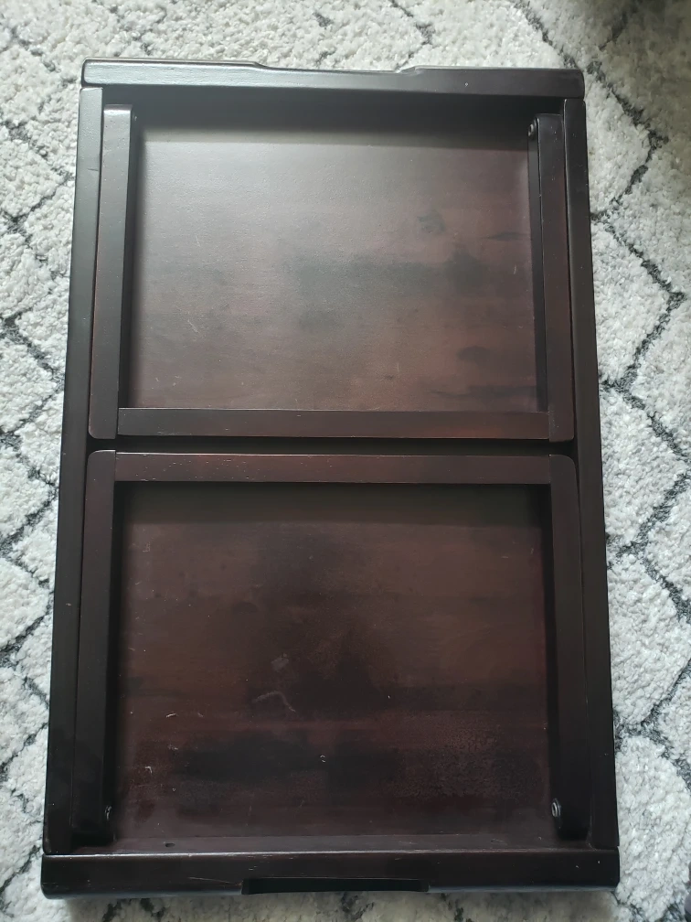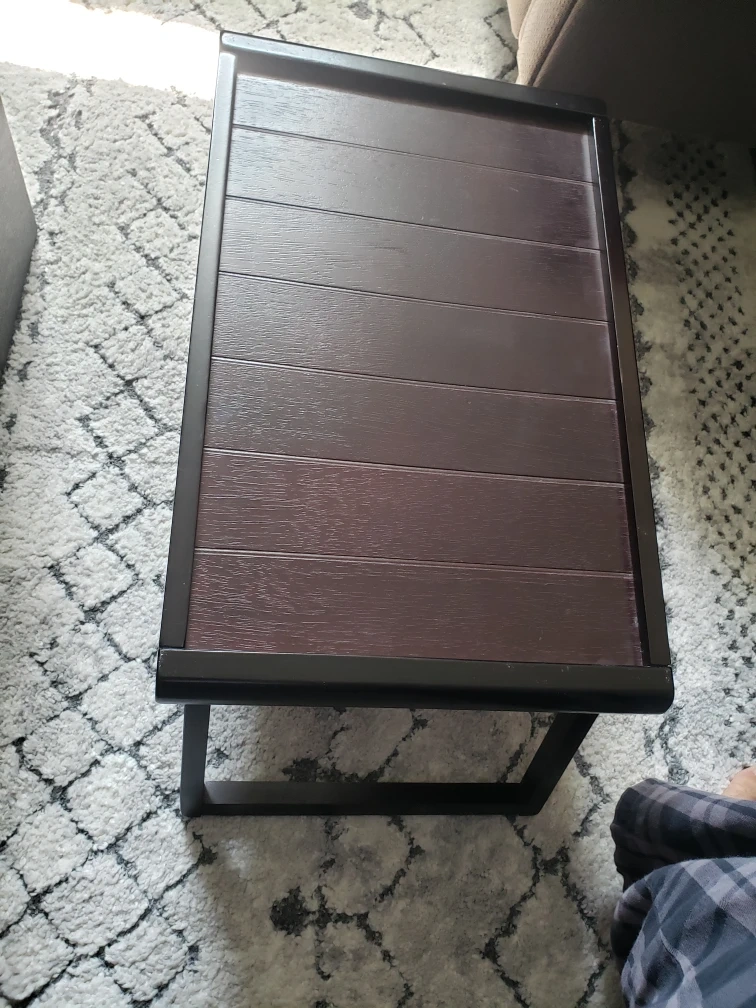 Here's a handy folding side table! It's in great shape and perfect for small spaces. The dark brown colour is neutral and will fit in with any decor. Folds up easily for storage or transport