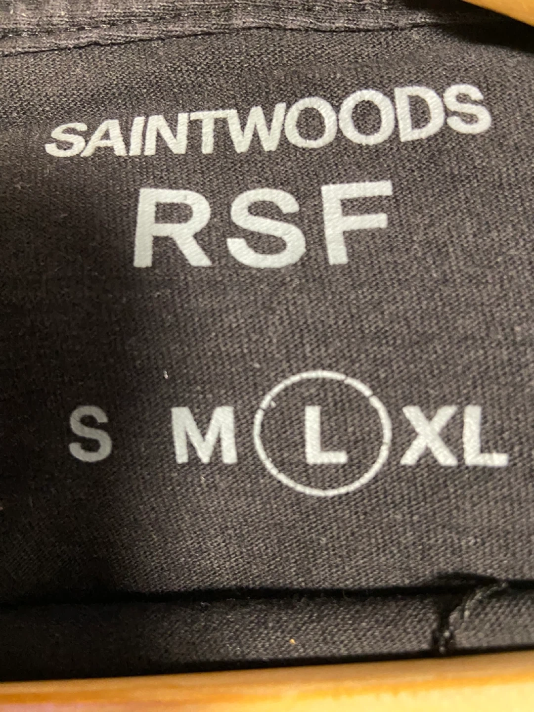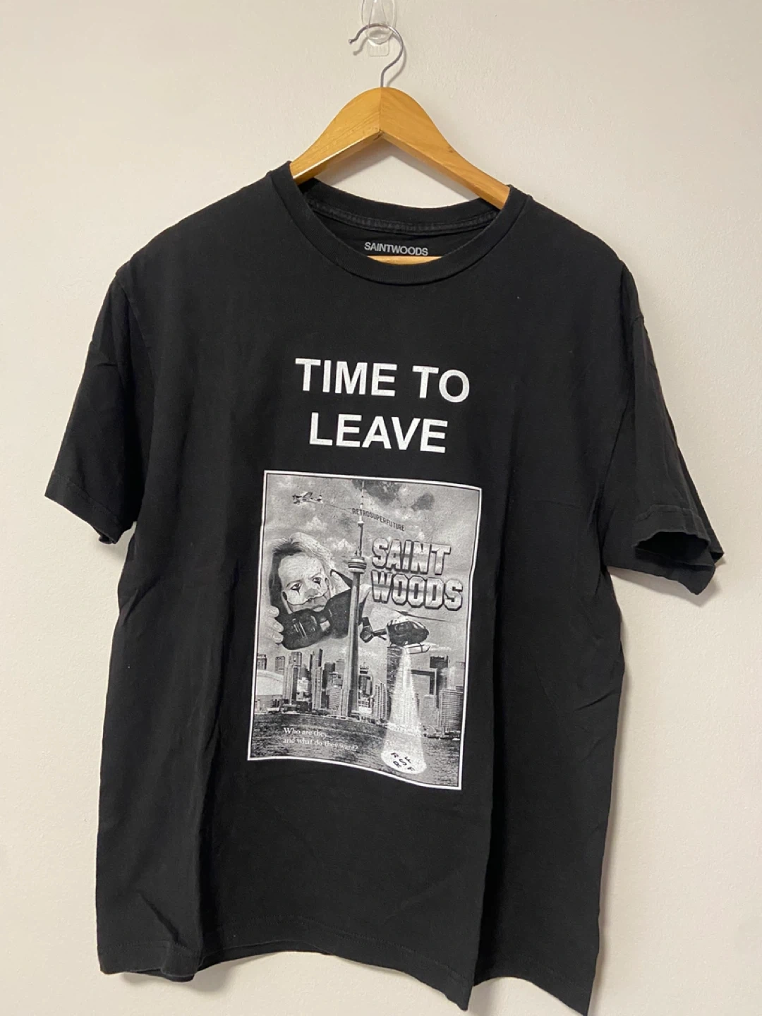 I'm selling a SAINTWOODS t-shirt in size L. It's black and features a 'Time To Leave' graphic. It's in great condition and ready for a new home!