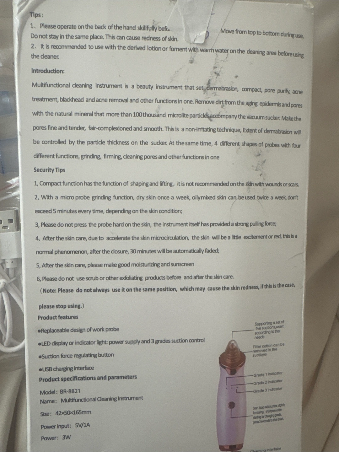 I'm selling a multifunctional cleaning instrument! It's a beauty instrument that helps with blackhead and acne removal, pore purification, and more. It comes with 4 different shaped probes for different functions, including grinding, firming, and cleaning pores. Also included is a USB charging interface and a set of filter cottons