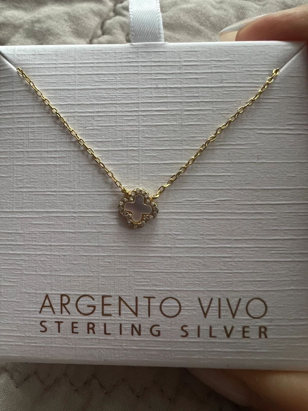 Selling a beautiful Argento Vivo sterling silver necklace. It's in great condition and comes with its original box. The necklace features a delicate gold chain and a clover-shaped pendant with sparkling accents. Perfect for adding a touch of elegance to any outfit!