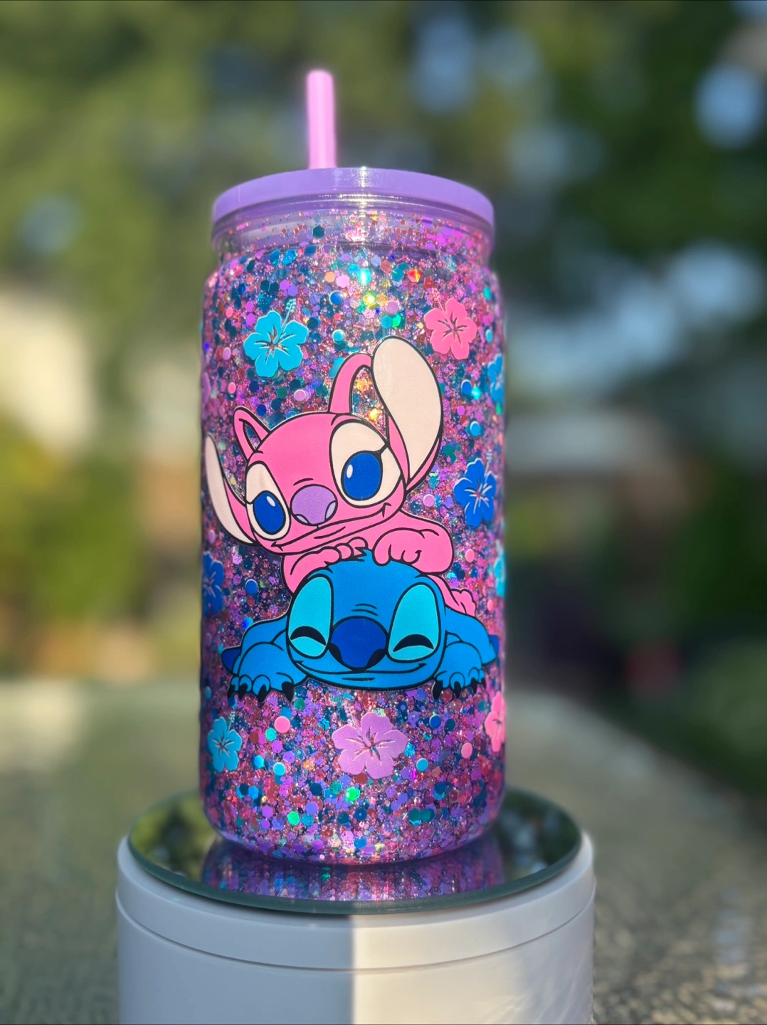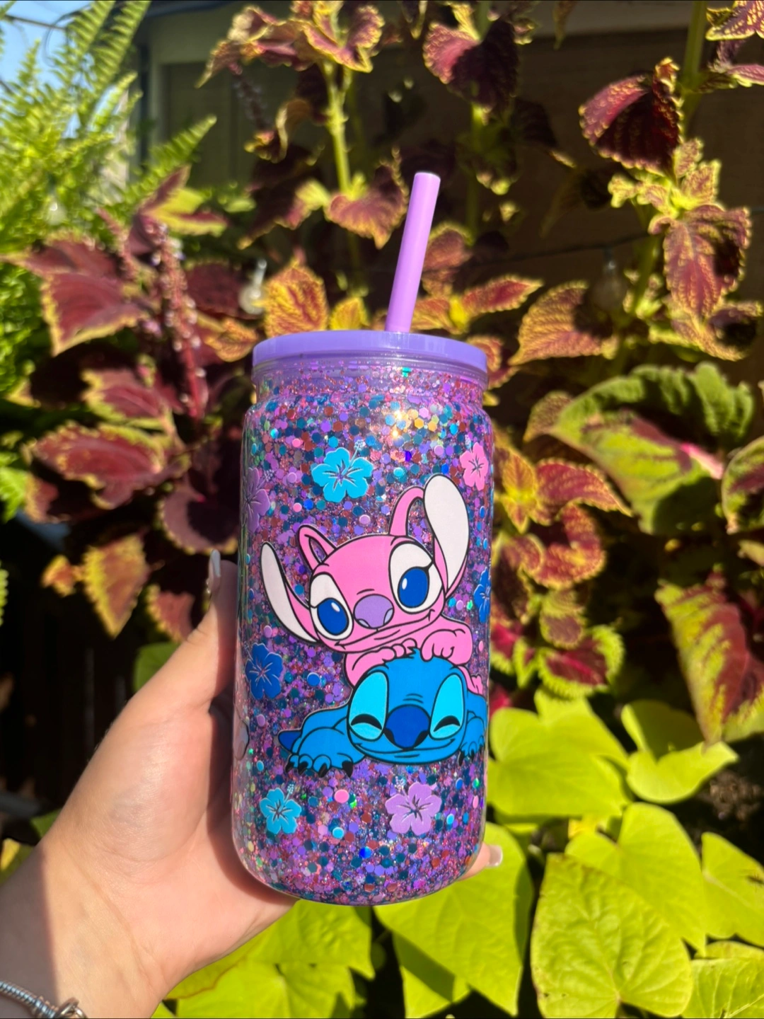 Check out this adorable handmade tumbler featuring Stitch and Angel! It's covered in beautiful glitter and has a straw, perfect for keeping your drinks cold and showing off your love for Lilo & Stitch $35