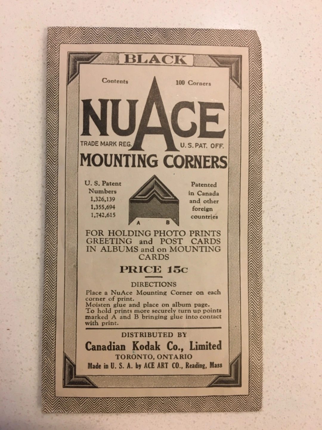 372I am offering a vintage NUACE mounting corners package, a nostalgic find for collectors and crafters alike! This package includes 100 black mounting corners, perfect for preserving your precious photos, greeting cards, and postcards in albums or on mounting cards. Please note that the package is used, reflecting its age, but the corners are intact and ready for use. * **Brand**: NUACE * **Colour**: Black * **Quantity**: 100 corners * **Intended Use**: Photo mounting, scrapbooking, crafting Given its vintage nature and rarity, I'm pricing this package at $10 CAD. Prices for similar vintage NUACE mounting corners on Kijiji range from $10 to $20 CAD, making this a fair deal for both the buyer and seller. If you are reading this, then it is still available! So don't delay, add this piece of history to your collection today! Thanks and please see my other ads!
