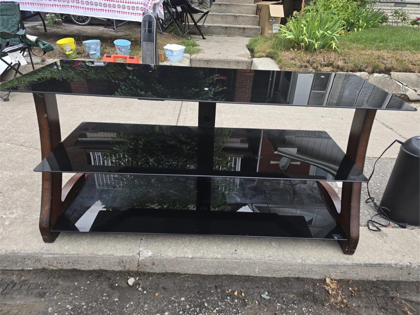 Selling a black glass TV stand in good condition. It has three shelves, perfect for storing your media devices and accessories. It's a stylish and functional piece for any living room setup