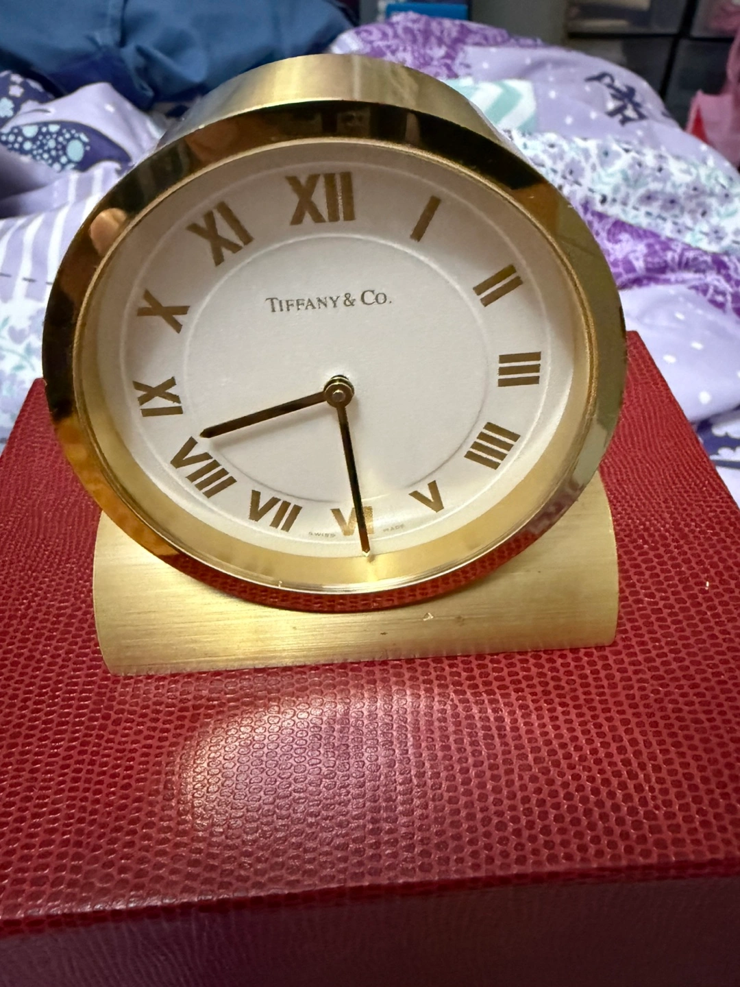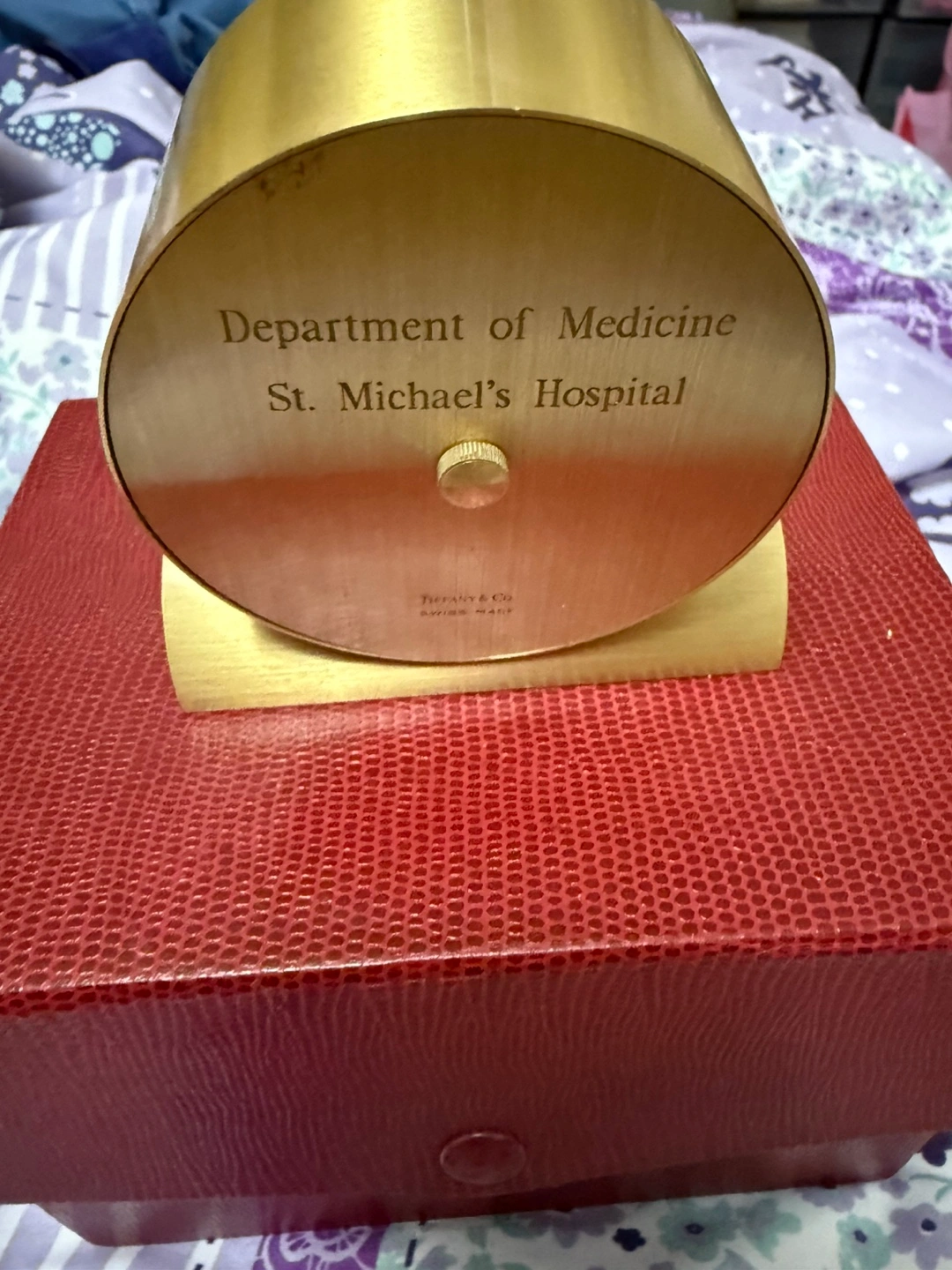Selling a Tiffany & Co. desk clock. It's Swiss made and comes in its original box. The clock has a gold finish with Roman numerals on the face. On the back, it says "Department of Medicine, St. Michael's Hospital". Sample battery in the picture only but not included battery. Kindly check the pictures carefully.