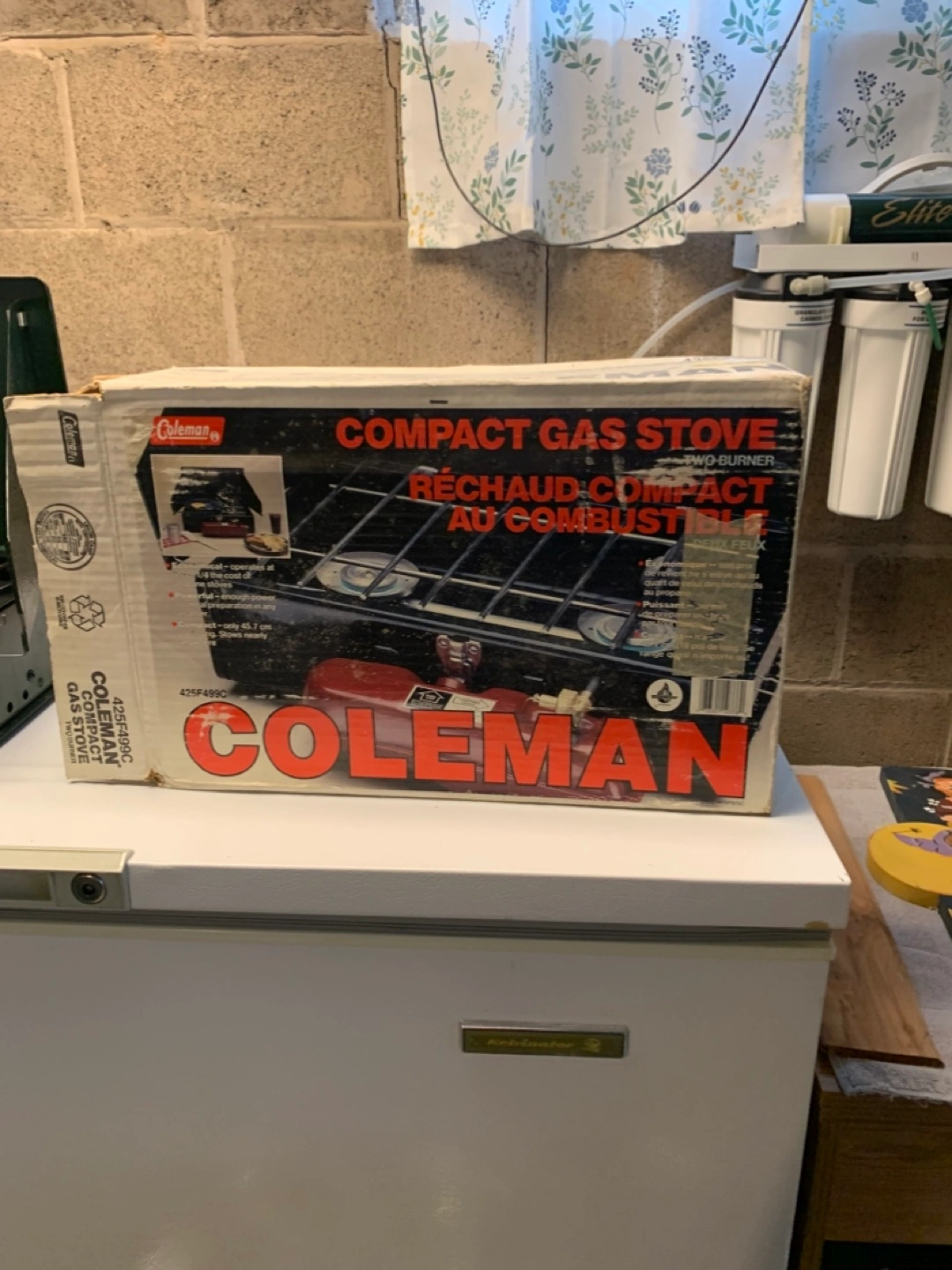 Selling a Coleman compact gas stove with two burners. It comes with the original box and stand. Perfect for camping or outdoor cooking!