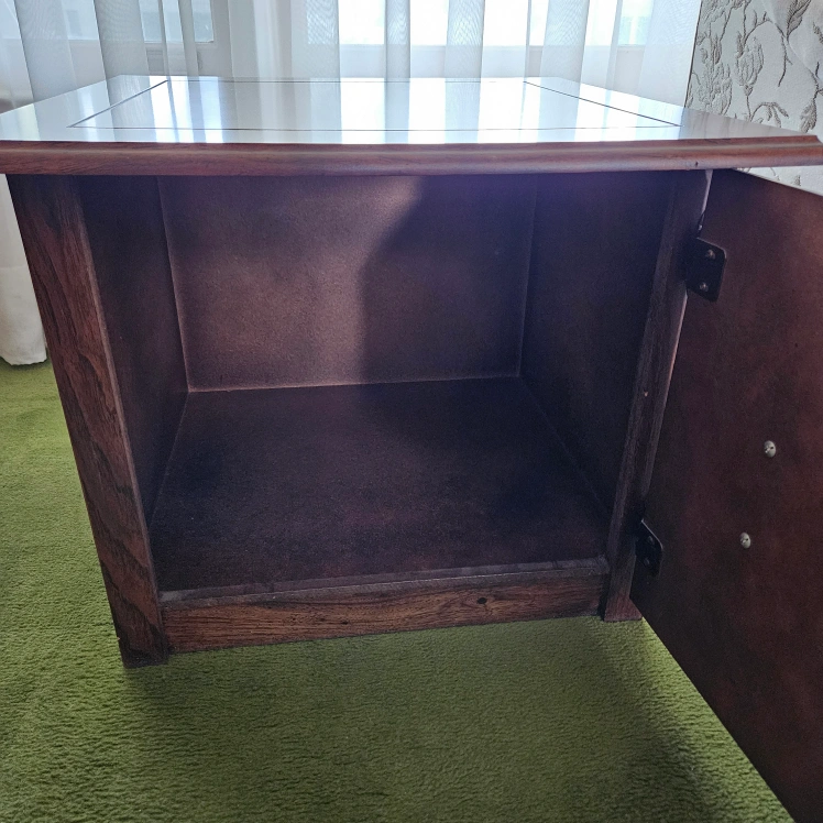 Selling a lovely vintage 2-tier wood coffee table and side table, in a beautiful dark wood finish. The table has a lower enclosed shelf for storage. The side table has one door with a large eclosed storage area. Both items are in excellent condition. These pieces would add a touch of classic style to any living room.