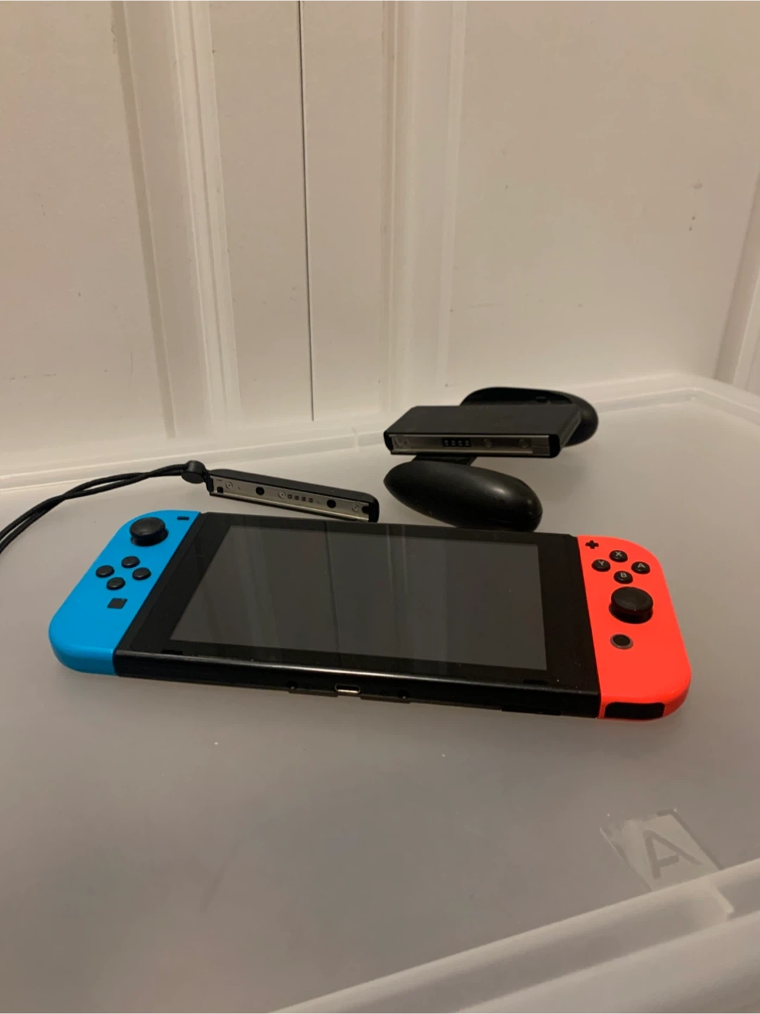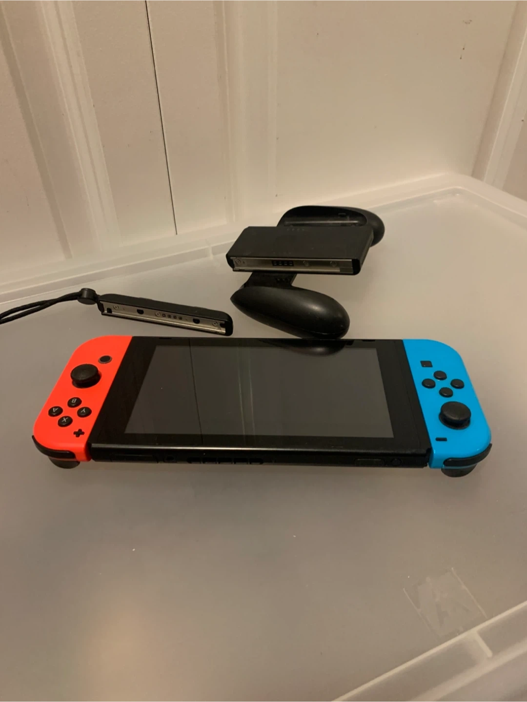 Nintendo Switch gaming console with red and blue Joy-Cons. Includes Joy-Con grip and wrist straps.