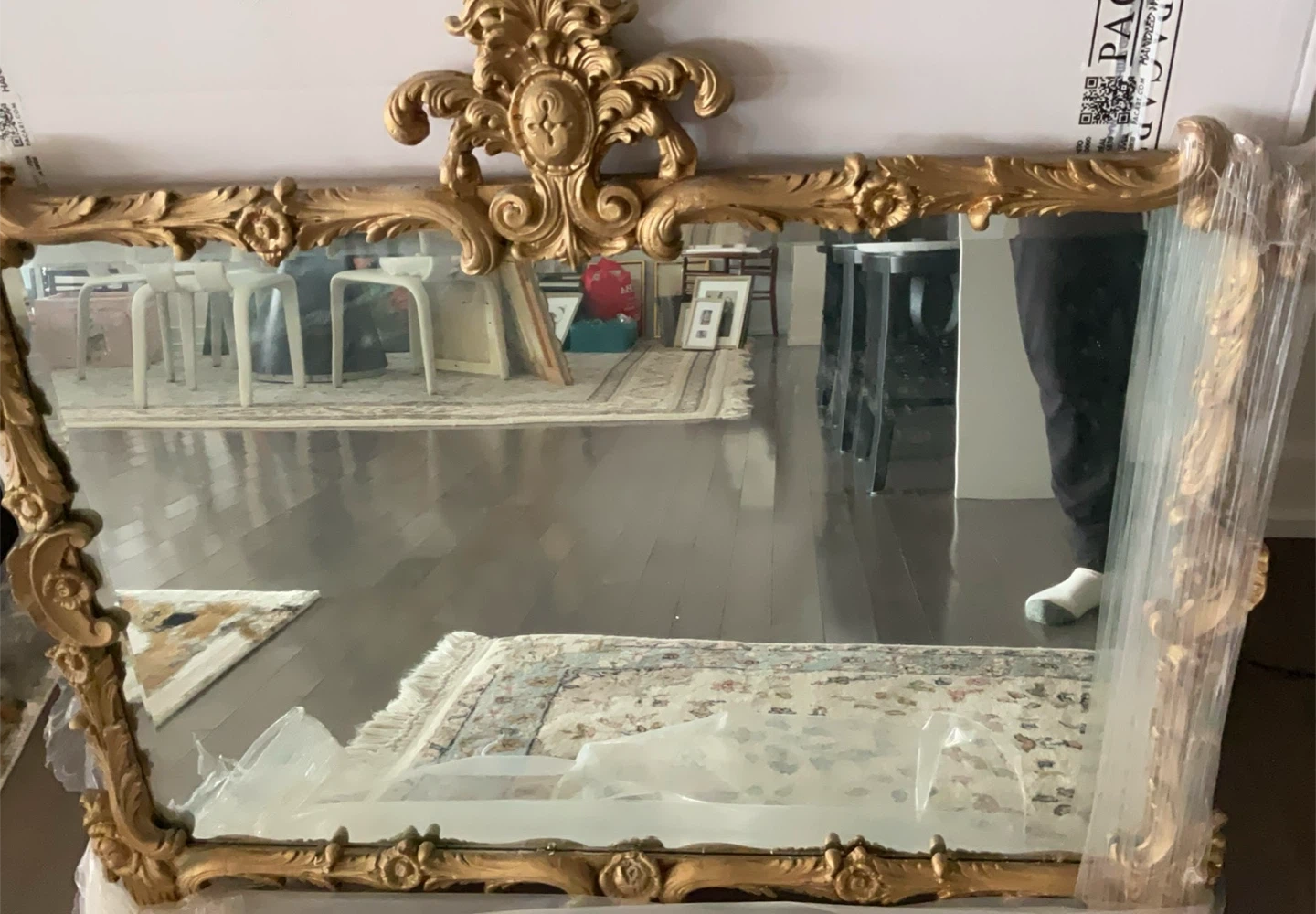 A beautiful mirror with an ornate gold gilded frame. The frame features intricate scrolling details and a central crest. It's designed to be a decorative piece for any room. Suitable for entryways or above a dresser.