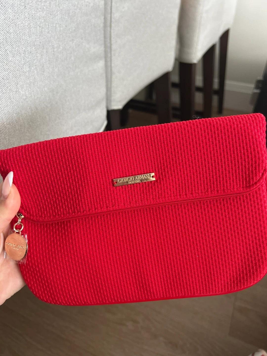 This is a red Giorgio Armani clutch pouch. It has a textured fabric exterior and a gold-tone logo plaque. Includes a small round charm attached to the zipper.