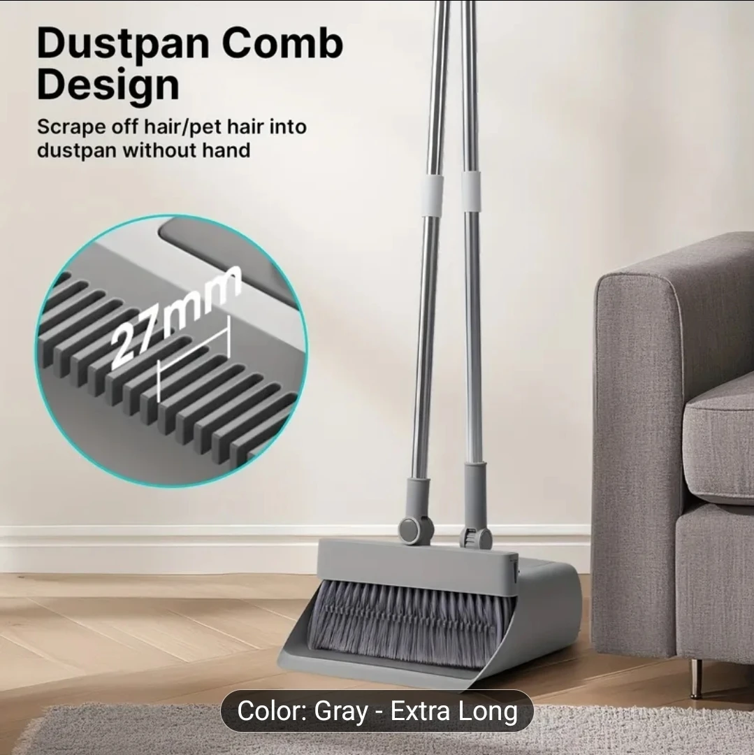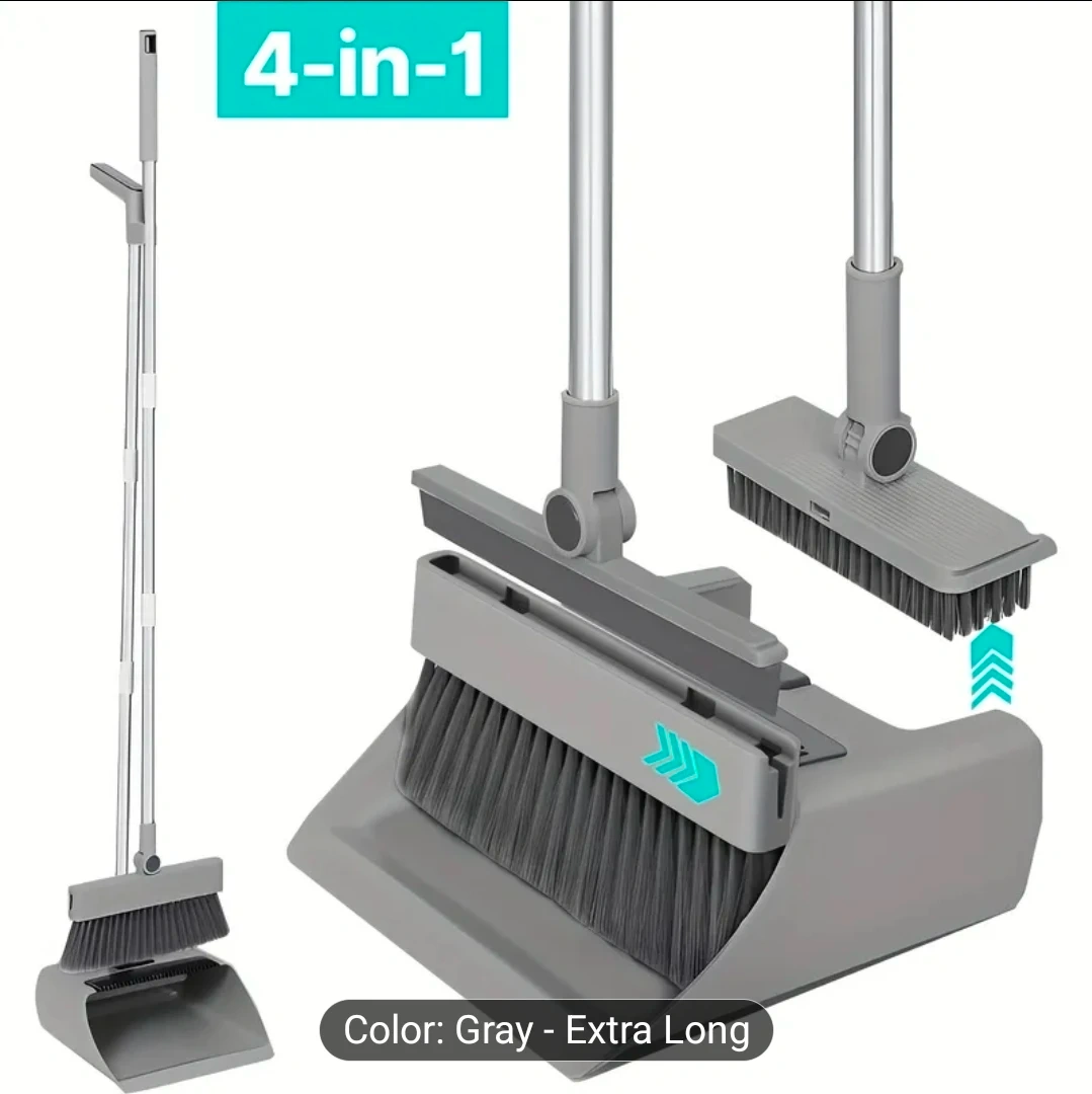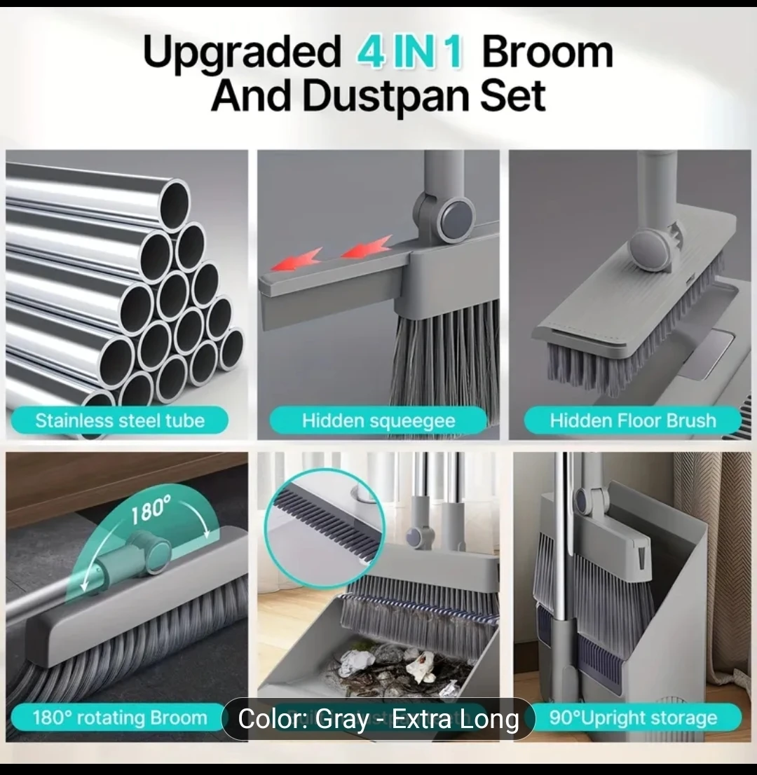 Upgraded 4-in-1 Broom and Dustpan Set - Gray Extra Long