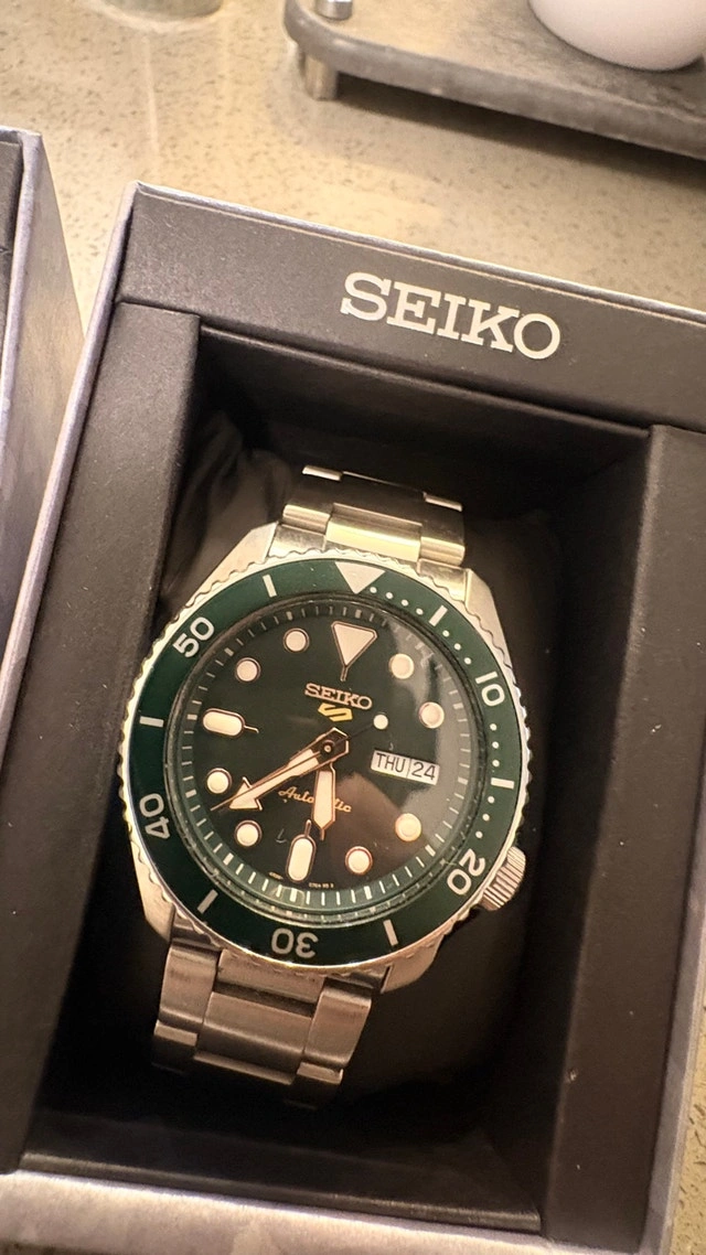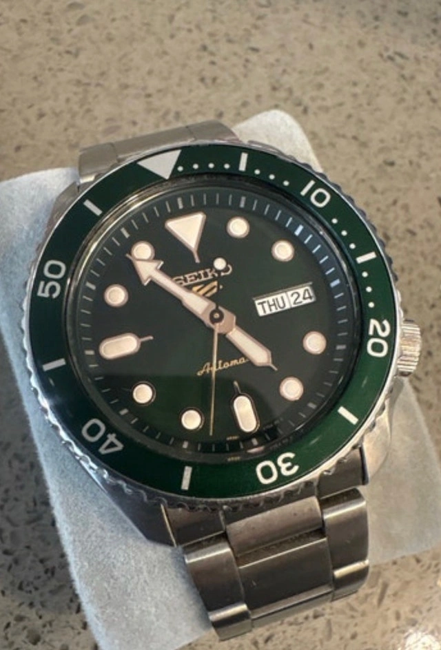 This is a Seiko 5 Sports SRPD63 automatic men's watch. It features a durable stainless steel case and bracelet, a distinctive green sunburst dial with rose gold accents, and a unidirectional rotating bezel. The watch is water-resistant up to 100 meters, making it suitable for swimming. It has a reliable Caliber 4R36 automatic movement with manual winding capacity and approximately 41 hours of power reserve. The Hardlex crystal is scratch-resistant. It includes a day/date display at the 3 o'clock position and LumiBrite on the hands and indexes for visibility in the dark. This watch comes with its original box, papers, tags, and extra links. It is in used, like-new condition. Cash accepted.