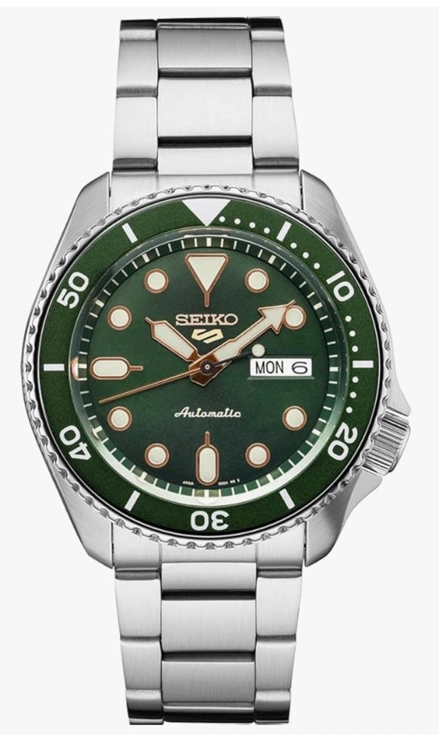This is a Seiko 5 Sports SRPD63 automatic men's watch. It features a durable stainless steel case and bracelet, a distinctive green sunburst dial with rose gold accents, and a unidirectional rotating bezel. The watch is water-resistant up to 100 meters, making it suitable for swimming. It has a reliable Caliber 4R36 automatic movement with manual winding capacity and approximately 41 hours of power reserve. The Hardlex crystal is scratch-resistant. It includes a day/date display at the 3 o'clock position and LumiBrite on the hands and indexes for visibility in the dark. This watch comes with its original box, papers, tags, and extra links. It is in used, like-new condition. Cash accepted.
