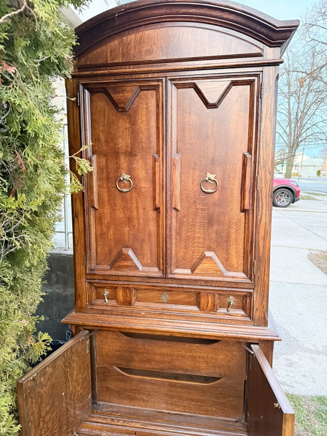 This beautiful armoire is crafted from solid oak with a rich, dark stain. It features two large doors on top, with several shelves and drawers inside. The bottom section has two more doors and drawers for ample storage. It's a sturdy piece with classic detailing and ring pulls.